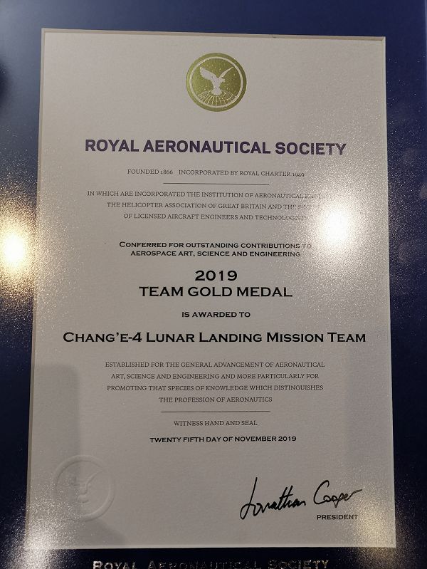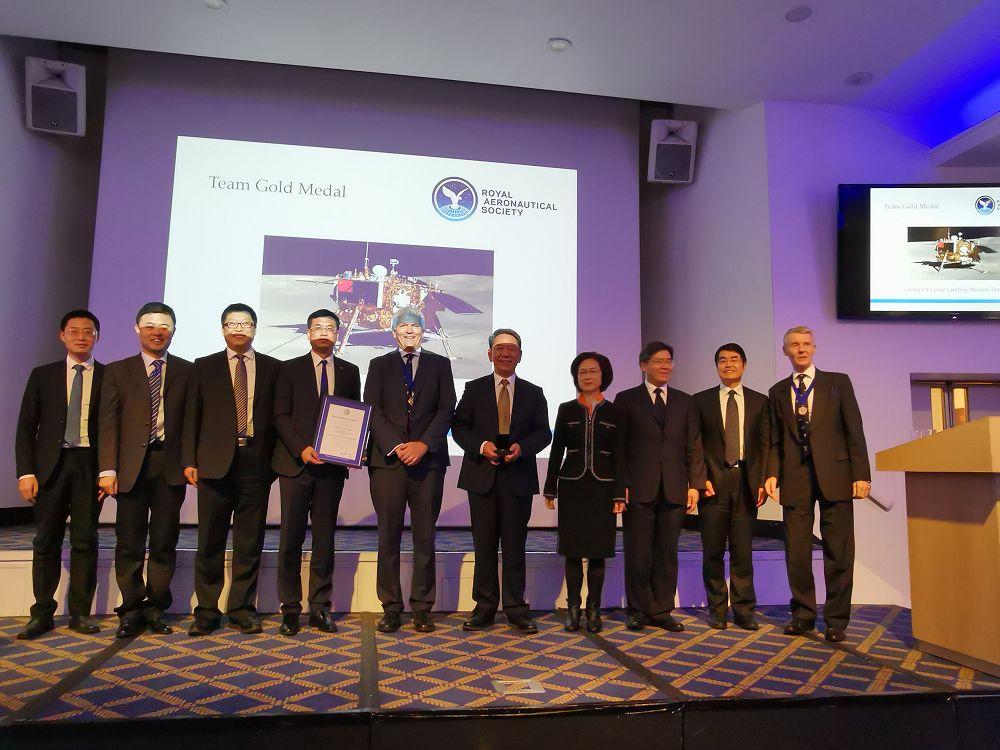 中国探月工程总设计师吴伟仁院士率嫦娥四号任务团队代表,受邀参加了此次颁奖典礼。吴伟仁代表嫦娥四号任务团队,向英国皇家航空学会和奖项委员会表示感谢,并欢迎更多国家或组织与中国开展航天国际交流与合作,共同助力人类太空探索与科学发现。