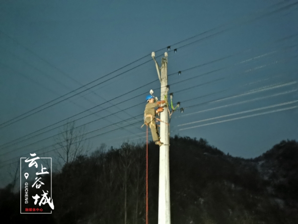 我是党员、我先上。不到20分钟,运维班班长李雪松带领9名党员服务队到供电所集结到位。唐鹏把所里的9名同志和南河的两名农电工划分为4个巡查专班,出动皮卡车一台,摩托车3辆。考虑到此次巡线排查任务重,他特意把熟悉辖区线路的专班调出来,翻山越岭步行踏勘巡线。 险情就是命令。接到任务后,11名队员带着检修器械和方便面,迎着漫天飞舞的雪花出发了。上午9点25分,专班在观音沟村找到第一个故障点,处理完险情后,依然送不上电。唐鹏考虑到当地镇村两级正在搞疫情防控工作,基层很多东西要往上传,急需用电,于是他果断下令断开分段开关,保证政府机关和镇直单位先用上电,然后继续巡线。南河的山本来就高,有些架设的线路下面根本没有路,踏着积雪去巡线,艰难可想而知。队员们发扬不怕吃苦、甘于奉献的精神,没有路,队员们拿镰刀砍,没有开水,中午在山上简单地啃几口方便面对付一下,继续查找故障点。下午1点40分,队员们在笋峪村又发现一处故障点,唐鹏再次下令断开分段开关,让笋峪村一部分群众先用上电。 风一直在刮、雨一直在下、雪一直在飘。巡线的队员们又冷又饿,但他们顾不上吃干粮,来不及停下脚步,因为他们知道,雨雪天气,线路长、路难走、任务重,为了让春节期间的群众尽快用上电,他们必须要和时间赛跑。到下午5点40分,4个专班全部巡完线路,共发现故障点4处,这些险情有的是绝缘子被击穿,有的是线路被烧断。唐鹏根据上报掌握的情况,及时给县供电公司汇报,并安排队员们做好各项准备工作,连夜进行抢修作业。当天晚上9点40分,队员们艰难的爬上几十米高的电线杆,进行高空作业。考虑到安全因素,队员们在当晚11点多收工,第二天上午继续施工。7日上午9点56分,全部恢复通电。 困难面前,勇挑重担,关键时刻,挺身而出。盛康供电所全体员工在抗击风雪灾害攻坚战中,成为风雪中最美的“逆行者”,为抗疫提供了强有力的保障。