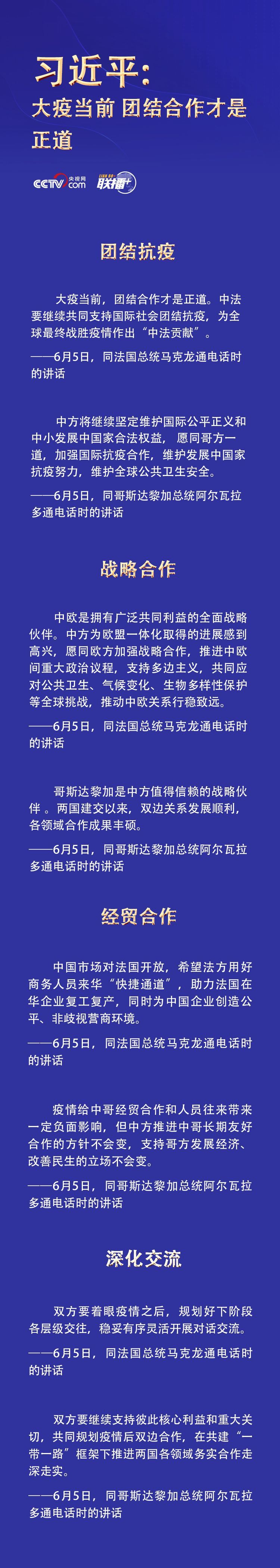 6月5日,习近平主席分别同法国总统马克龙、哥斯达黎加总统阿尔瓦拉多通电话。 当前,全球疫情扩散蔓延势头尚未得到有效遏制,加强国际抗疫合作,维护全球公共卫生安全尤为重要。习近平主席最新的两次“电话外交”有哪些看点?就共同迎接挑战释放了哪些积极信号? 央视网《联播+》特梳理,为您一起学习。