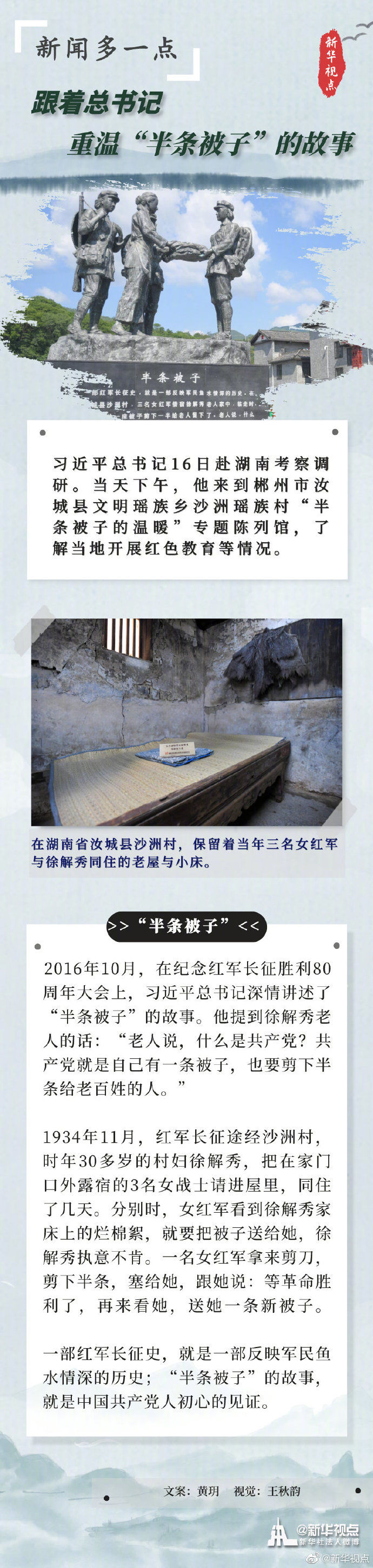 习近平总书记16日赴湖南考察调研。当天下午,他来到郴州市汝城县文明瑶族乡沙洲瑶族村“半条被子的温暖”专题陈列馆、村服务中心和卫生室、沙洲现代农旅示范基地、文明瑶族乡第一片小学,以及村民家中,了解当地开展红色教育、发展扶贫产业、巩固脱贫成果等情况。(文字记者张晓松、朱基钗 摄影记者李学仁、谢环驰、岳月伟 )