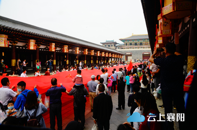上午十点整,在唐城景区朱雀廊上有一支红色的队伍,他们手举红旗高唱红歌,迈着矫健的步伐,随着一曲《歌唱祖国》响起,一面71米长,象征祖国71周年的巨型红旗,随着游行队伍向前前进。来自五湖四海的游客朋友们被现场爱国气氛所感染,纷纷加入,一起进行爱国方阵游行,共同祝愿伟大的祖国母亲生日快乐,繁荣昌盛!