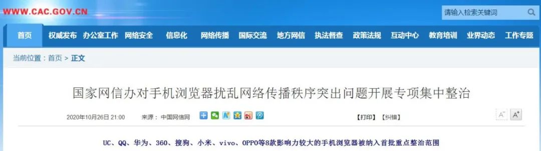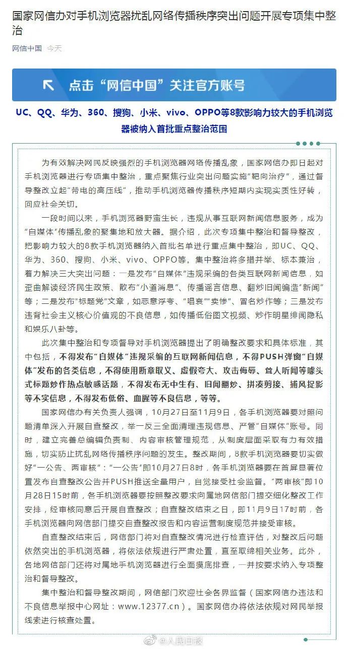 10月26日 国家网信办发布公告 为有效解决网民 反映强烈的 手机浏览器网络传播乱象 即日起 国家网信办 对手机浏览器 进行专项集中整治