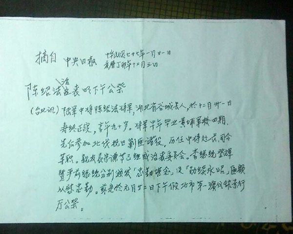 国民党对陈绍发将军的褒扬令 陈绍发(1899—1987),字绳武、入黄埔参加革命军行列后改名绍法、字神武,光绪己亥(1899年)年腊月初四日亥时生于湖北省谷城县石花镇喜尔弯(巩湾村)。其祖自乾隆年间由湖北黄州圻水卢家湖兴隆社迁谷城石花街世居。公先世耕读相承,四岁丧父、甫六岁,入私塾,得识文字,早岁入石花街教堂牧羊(洋人牧师的奶羊),公幼年时半牧羊半读私塾,至十五岁私塾毕。公性沉静,好读书,用功勤勉,乐之如饴。其母汪太夫人帮石花街基督教堂杂务,公得教堂挪威籍基督传教士Rikard Olsen(中文名字吴道钦)之资助毕业于老河口育英中学。民国十年三月自老河口育英中学毕业,后返石花街旋被聘为紫荆洞基督教会学堂老师。十一年五月紫荆洞(今紫金镇)闹匪患到盛家康(康字左边有土字旁,电脑打不出来。)任基督教教会学校老师,十三年五月与同乡同窗范友信任石花街基督教教会高级小学高级教师,十四年三月兼任石花街基督教会教堂查账员。 十四年春同乡老河口育英中学同窗黄埔三期黄鼎新知绍发才略。因謂云:“今粵府募兵黃埔,何不投之?”绍发聞,十四年八月遂南下廣州,十月考試入黃埔為第四期生。十六年,任中央军校武汉分校第六期学生队长。十七年至十九年任南京总司令部经理处处员,负责北伐前线押运解款点验,日经百万大洋,分毫不差。十九年任陆军第十师营长、团副、团长。二十一年任陆海空军总司令部侍卫总队科长。 二十三年十月入南京中央军校高教班第三期深造。二十四年奉派选西北军孙连仲部三十军少将参谋长,将军智勇兼备深获孙将军赏识。嗣以有关全军人事、经理、教育、作战诸端,均赖将军统筹策划,锐意加于改革,使全军战力加强,士气振奋着有勋绩。迨至二十五年十二月,张、杨发难兵谏,囚蒋公于西安,上令绍法赴京请缨讨伐。 抗战军兴将军亦首先出兵参加抗日,着有战功。二十六年任孙连仲部第二集团军高参,二十七年参加台儿庄会战。二十八年任孙连仲部第二集团军三十师参谋长。二十九年将军奉调第三十七补训处首任中将处长,镇河南汝南县城关练兵,编练二十余团。 三十年十二月太平洋战争爆发,为保护国际支援中国战区重要生命线之滇缅线需要大量兵员,亦为支援滇缅印度远征军作战。三十一年战局快速演变,将军回籍练兵,辖豫、鄂、皖计十八个师管区按月各挑一营500人送该处编练成团,次第开往川滇交印度。日常训练规模计谷城县城关、石化街、盛康共六个团,时为抗战时期国内最大补训处。将军任职三十七补训处处长前后六年,与第五战区司令长官李宗仁及同僚素有交情,经常公余赴五战区司令长官部饮酒讨论时局,抗战时李宗仁前往薤山避暑,弃用五战区司令长官部警卫特务团选用三十七补训处警卫连负责来回全程安保护送。将军由于训练精湛,迭获蒋委员长召见嘉励,并蒙当时何总参谋长应钦上将在重庆举行军事会报时宣布该训练处成绩第一,明令嘉奖。三十四年抗战胜利补训处结束,调国民ZF国防部部员。 三十七年续任鄂中师管区中将司令,三十八年派任海南岛第四纵队司令,三十八年冬去台,奉派国防部高级参议,于1959年退出国军现役后出任台湾邮政总局顾问。1987年12月31日将军突于心肌衰竭,蒙主恩招寿终台北寓所,享寿九十。将军生性温良、诚信稳健、处事严谨,深得长官信任,属下爱戴。将军身材伟岸有尚武之风,转战各地,勤于读书,将军在谷城练兵期间,尤为注重军纪,深得石化街当地百姓爱戴。将军经常训诫部下曰:凡我革命军人,不得骚扰百姓,如有发现者,我陈绍发认识你,我陈绍发的枪不认识你!七十多年过去了,石花街民间一直心怀对陈将军敬重。将军娶妻三房,大房郑氏、二房丁氏、三房张氏。将军有五子七女学有所成分居大陆、台湾和海外。 (谷城新闻网记者卢燕整理) |