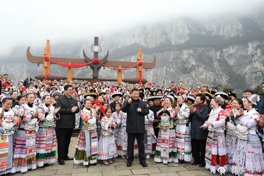 春节前夕,习近平总书记赴贵州考察调研并看望慰问基层干部群众。3日下午,他来到毕节市黔西县,实地察看乌江六冲河段生态环境,走进新仁苗族乡化屋村看望乡亲们。在村文化广场,习近平同参加少数民族春节民俗活动的群众亲切交流,并向全国各族人民致以新春祝福。