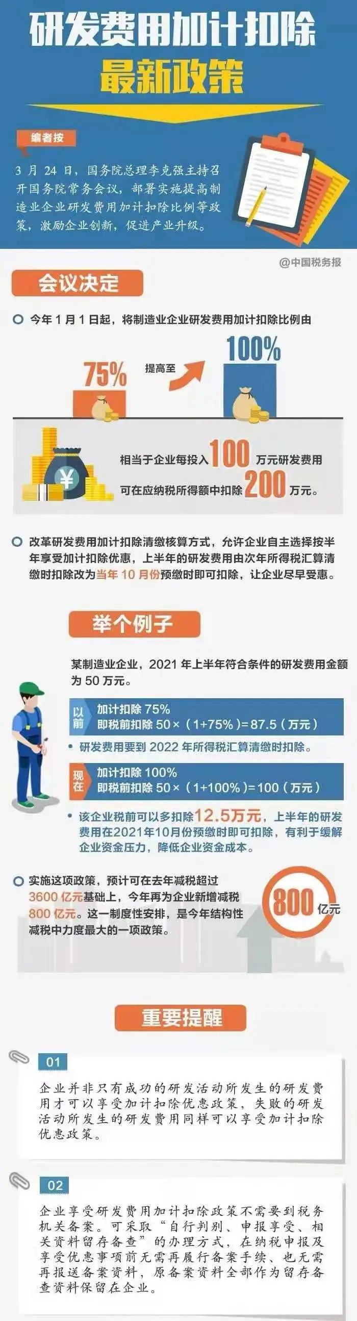 支持创新,财税政策的撬动作用不可小觑。最近,研发费用加计扣除政策成了社会各界关注的热点。 今年的《政府工作报告》指出,延续执行企业研发费用加计扣除75%政策,将制造业企业加计扣除比例提高到100%。刚刚召开的国务院常务会议,对这一政策实施方案进行部署。 那么,这项政策会给企业带来怎样的利好?简单地说,将制造业企业研发费用加计扣除比例由75%提高至100%,相当于企业每投入100万元研发费用,可在应纳税所得额中扣除200万元。国务院常务会议指出,实施这项政策,预计可在去年减税超过3600亿元基础上,今年再为企业新增减税800亿元。这一制度性安排,可以说是今年结构性减税中力度最大的一项政策。