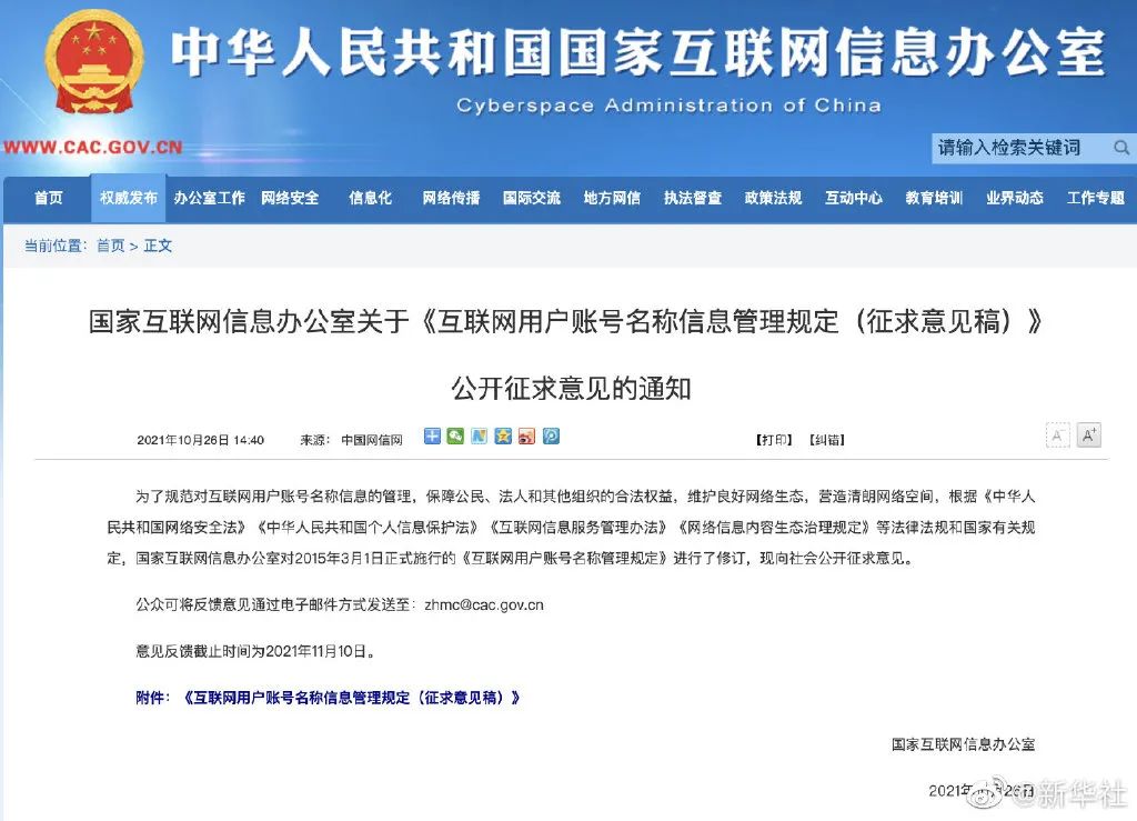 为加强对互联网用户账号名称信息的管理,保护公民、法人和其他组织的合法权益,国家网信办26日公布《互联网用户账号名称信息管理规定(征求意见稿)》,并向社会公开征求意见。根据征求意见稿,互联网用户账号使用者注册账号时,应当与互联网用户账号服务平台签订协议,提供真实身份信息。