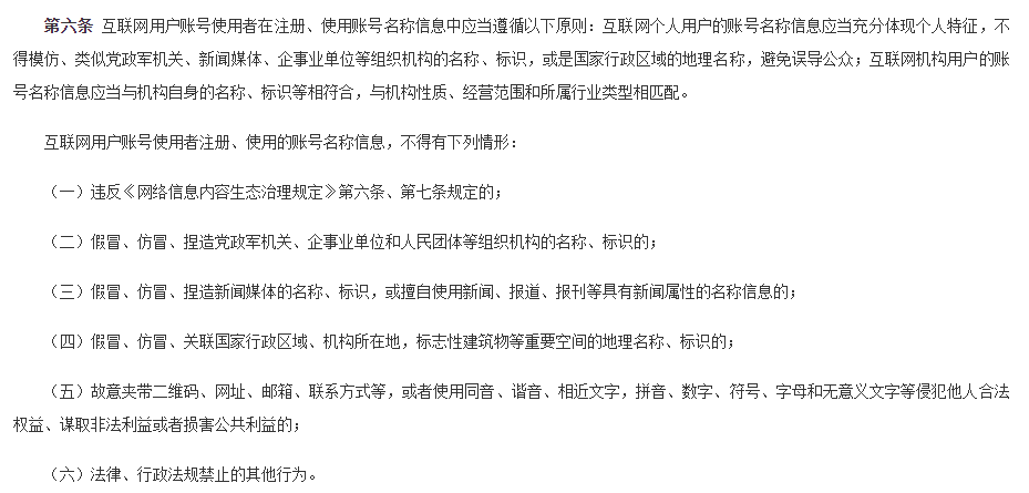 根据《互联网用户账号名称信息管理规定(征求意见稿)》第六条, 互联网用户账号使用者注册、使用的账号名称信息,不得有下列情形: (一)违反《网络信息内容生态治理规定》第六条、第七条规定的; (二)假冒、仿冒、捏造党政军机关、企事业单位和人民团体等组织机构的名称、标识的; (三)假冒、仿冒、捏造新闻媒体的名称、标识,或擅自使用新闻、报道、报刊等具有新闻属性的名称信息的; (四)假冒、仿冒、关联国家行政区域、机构所在地,标志性建筑物等重要空间的地理名称、标识的; (五)故意夹带二维码、网址、邮箱、联系方式等,或者使用同音、谐音、相近文字,拼音、数字、符号、字母和无意义文字等侵犯他人合法权益、谋取非法利益或者损害公共利益的; (六)法律、行政法规禁止的其他行为。 来源:新华社、中国网信网、新华网 责任编辑:房景智 / 编审:翟竞
