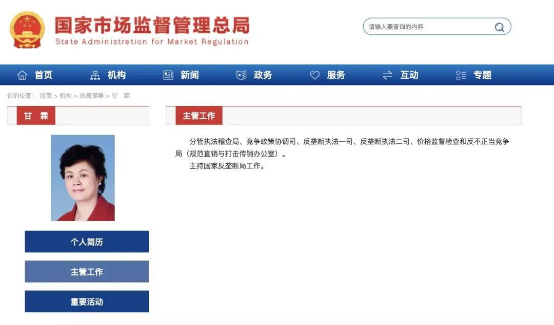 国家市场监督管理总局官网上显示甘霖的主管工作为分管执法稽查局、竞争政策协调司、反垄断执法一司、反垄断执法二司、价格监督检查和反不正当竞争局(规范直销与打击传销办公室)。主持国家反垄断局工作。 来源:新华社、南方都市报 题图源自央视新闻