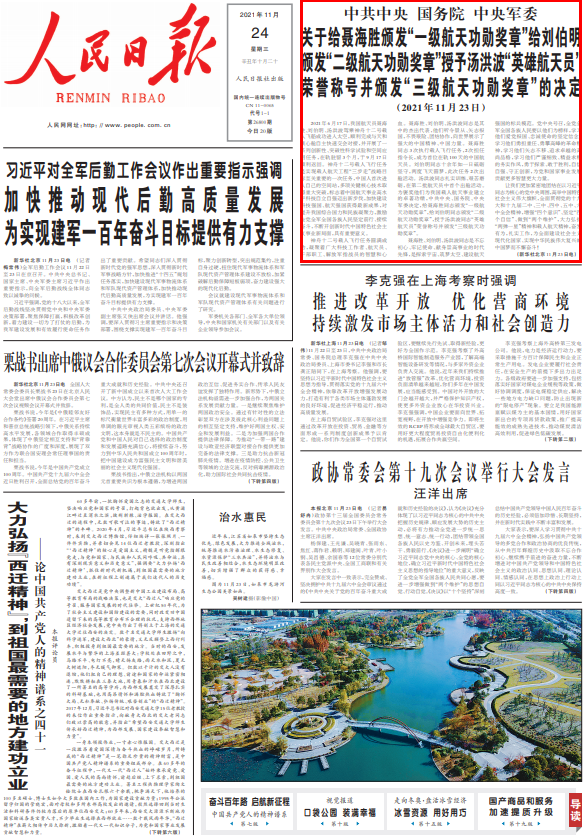 中共中央 国务院 中央军委 关于给聂海胜颁发“一级航天功勋奖章”给刘伯明颁发“二级航天功勋奖章” 授予汤洪波“英雄航天员”荣誉称号并颁发“三级航天功勋奖章”的决定 (2021年11月23日) 2021年6月17日,我国航天员聂海胜、刘伯明、汤洪波驾乘神舟十二号载人飞船成功进入太空,顺利完成与天和核心舱自主快速交会对接,并开展了一系列创新性、突破性科学试验和空间应用任务,在轨驻留3个月,于9月17日顺利返回。神舟十二号载人飞行任务是实现载人航天工程“三步走”战略目标至关重要的一次任务,中国人首次进入自己的空间站,多项关键核心技术取得重大突破,标志着中国航天事业高水平科技自立自强迈出新步伐,加快建设科技强国、航天强国获得最新成果,对提升我国综合国力和民族凝聚力,激励全党全军全国各族人民坚定前行、接续奋斗,不断开创新时代中国特色社会主义事业新局面,具有重要意义。 神舟十二号载人飞行任务圆满成功,凝聚着广大科技工作者、航天员、干部职工、解放军指战员的智慧和心血。聂海胜、刘伯明、汤洪波同志是其中的杰出代表,他们听令景从、矢志报国,不畏艰险、团结协作,向世界展示了强大的中国精神、中国力量。聂海胜同志3次执行载人飞行任务,2次担任指令长,成为首位在轨100天的中国航天员。刘伯明同志十余年如一日砥砺坚守,两度飞天圆梦,此次任务2次出舱活动。汤洪波同志扎实训练、艰苦磨砺,在第二批航天员中首个出舱活动。为褒奖他们为我国载人航天事业建立的卓著功绩,中共中央、国务院、中央军委决定,给聂海胜同志颁发“一级航天功勋奖章”,给刘伯明同志颁发“二级航天功勋奖章”,授予汤洪波同志“英雄航天员”荣誉称号并颁发“三级航天功勋奖章”。 聂海胜、刘伯明、汤洪波同志是不忘初心、牢记使命、献身崇高事业的时代先锋,是探索宇宙、筑梦太空、建设航天强国的标兵模范。党中央号召,全党全军全国各族人民要以他们为榜样,学习他们爱党报国、忠诚使命的坚定信念,学习他们勇担重任、勇攀高峰的革命精神,学习他们矢志不移、追求卓越的高尚品格,学习他们严谨细致、精益求精的务实作风,勇于探索、敢于胜利,自信自强、守正创新,为党和国家事业发展贡献更多智慧更大力量。 让我们更加紧密地团结在以习近平同志为核心的党中央周围,高举中国特色社会主义伟大旗帜,全面贯彻党的十九大和十九届二中、三中、四中、五中、六中全会精神,增强“四个意识”、坚定“四个自信”、做到“两个维护”,大力弘扬“两弹一星”精神和载人航天精神,奋发有为,扎实工作,为全面建设社会主义现代化国家、实现中华民族伟大复兴的中国梦而不懈奋斗! 来源:人民日报 学习大国 责任编辑:邓植元 / 编审:严华萍