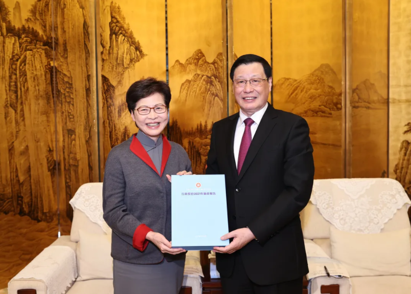 会见结束后,林郑月娥代表香港特区政府向湖北赠送《2021年施政报告》。 国务院港澳办副主任黄柳权;香港特区政府政务司司长李家超等参加会见。 来源:湖北日报 责任编辑:邓植元 / 编审:严华萍