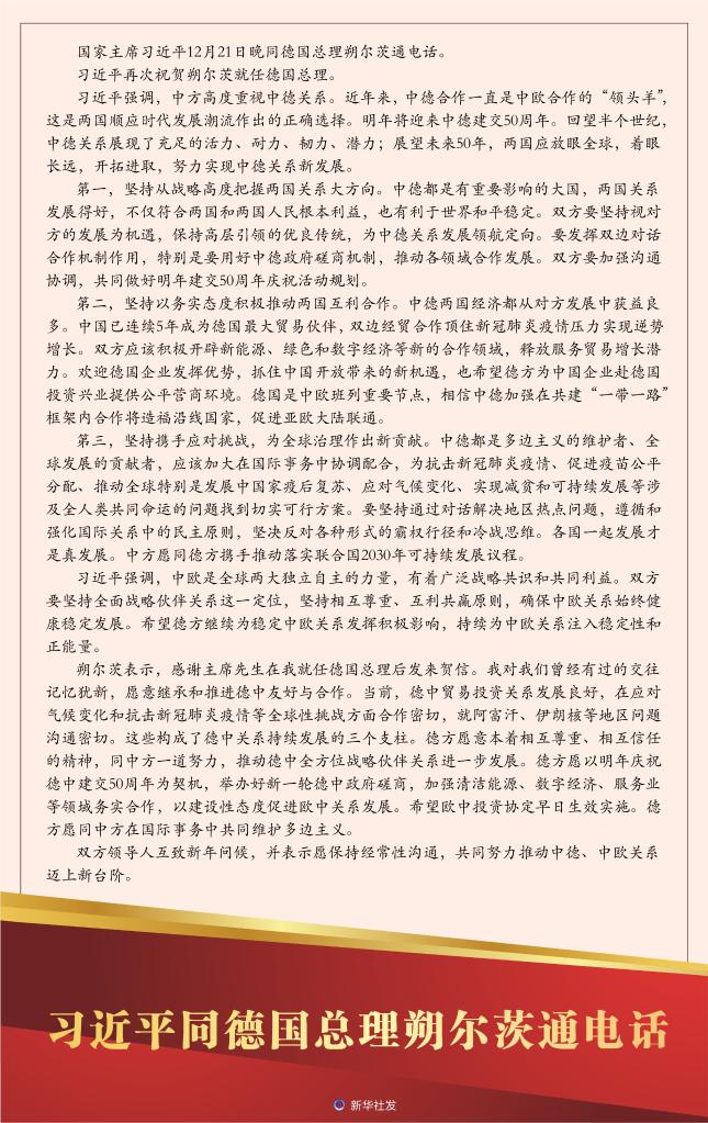 国家主席习近平12月21日晚同德国总理朔尔茨通电话。 习近平再次祝贺朔尔茨就任德国总理。 习近平强调,中方高度重视中德关系。近年来,中德合作一直是中欧合作的“领头羊”,这是两国顺应时代发展潮流作出的正确选择。明年将迎来中德建交50周年。回望半个世纪,中德关系展现了充足的活力、耐力、韧力、潜力;展望未来50年,两国应放眼全球,着眼长远,开拓进取,努力实现中德关系新发展。 第一,坚持从战略高度把握两国关系大方向。中德都是有重要影响的大国,两国关系发展得好,不仅符合两国和两国人民根本利益,也有利于世界和平稳定。双方要坚持视对方的发展为机遇,保持高层引领的优良传统,为中德关系发展领航定向。要发挥双边对话合作机制作用,特别是要用好中德政府磋商机制,推动各领域合作发展。双方要加强沟通协调,共同做好明年建交50周年庆祝活动规划。 第二,坚持以务实态度积极推动两国互利合作。中德两国经济都从对方发展中获益良多。中国已连续5年成为德国最大贸易伙伴,双边经贸合作顶住新冠肺炎疫情压力实现逆势增长。双方应该积极开辟新能源、绿色和数字经济等新的合作领域,释放服务贸易增长潜力。欢迎德国企业发挥优势,抓住中国开放带来的新机遇,也希望德方为中国企业赴德国投资兴业提供公平营商环境。德国是中欧班列重要节点,相信中德加强在共建“一带一路”框架内合作将造福沿线国家,促进亚欧大陆联通。 第三,坚持携手应对挑战,为全球治理作出新贡献。中德都是多边主义的维护者、全球发展的贡献者,应该加大在国际事务中协调配合,为抗击新冠肺炎疫情、促进疫苗公平分配、推动全球特别是发展中国家疫后复苏、应对气候变化、实现减贫和可持续发展等涉及全人类共同命运的问题找到切实可行方案。要坚持通过对话解决地区热点问题,遵循和强化国际关系中的民主原则,坚决反对各种形式的霸权行径和冷战思维。各国一起发展才是真发展。中方愿同德方携手推动落实联合国2030年可持续发展议程。 习近平强调,中欧是全球两大独立自主的力量,有着广泛战略共识和共同利益。双方要坚持全面战略伙伴关系这一定位,坚持相互尊重、互利共赢原则,确保中欧关系始终健康稳定发展。希望德方继续为稳定中欧关系发挥积极影响,持续为中欧关系注入稳定性和正能量。 朔尔茨表示,感谢主席先生在我就任德国总理后发来贺信。我对我们曾经有过的交往记忆犹新,愿意继承和推进德中友好与合作。当前,德中贸易投资关系发展良好,在应对气候变化和抗击新冠肺炎疫情等全球性挑战方面合作密切,就阿富汗、伊朗核等地区问题沟通密切。这些构成了德中关系持续发展的三个支柱。德方愿意本着相互尊重、相互信任的精神,同中方一道努力,推动德中全方位战略伙伴关系进一步发展。德方愿以明年庆祝德中建交50周年为契机,举办好新一轮德中政府磋商,加强清洁能源、数字经济、服务业等领域务实合作,以建设性态度促进欧中关系发展。希望欧中投资协定早日生效实施。德方愿同中方在国际事务中共同维护多边主义。 双方领导人互致新年问候,并表示愿保持经常性沟通,共同努力推动中德、中欧关系迈上新台阶。