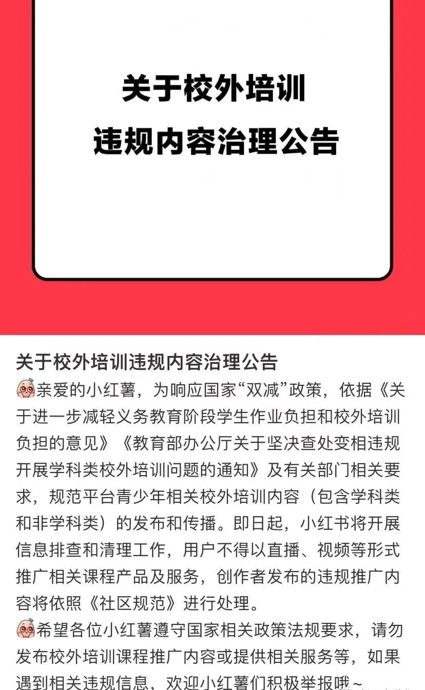小红书表示,即日起将开展信息排查和清理工作,用户不得以直播、视频等形式推广相关课程产品及服务,创作者发布的违规推广内容将依照《社区规范》进行处理。 随着“双减”政策推进,原从事于K9学科校外培训的教师面临失业困境。成为知识博主是其转型途径之一,在小红书上也不乏从教培业转行的教师分享学科、育儿知识,此类分享是否受限引发关注。 根据12月21日教育部新闻发布会,“双减”以来,学科类培训得到大幅压减,目前线下校外培训机构已压减83.8%,线上校外培训机构已压减84.1%。 教育部在会上提到,在校外培训机构治理工作中,指导抖音、微信、钉钉等平台企业主动开展清理工作,坚决防止隐形变异违规培训行为蔓延,并组织暗访巡查,核查举报线索。 微信官宣禁止 12月3日,微信团队宣布:为响应国家“双减”政策,依照《关于进一步减轻义务教育阶段学生作业负担和校外培训负担的意见》及教育主管部门相关要求,即日起,微信平台将进一步规范学科类培训内容的发布和传播。此外,也对在其平台发布的面向中小学生(含幼儿园学龄前儿童)的非学科类校外培训机构的内容作出合规指引。 在《微信关于规范校外培训内容发布和传播的合规指引》中,微信提到了两点: 一是不得在微信平台发布面向中小学生(含幼儿园学龄前儿童)学科类和非学科类校外培训机构的推广性、诱导性内容,以及“贩卖教育焦虑”、承诺迅速提高考试成绩的内容; 二是不得利用微信平台面向中小学生(含幼儿园学龄前儿童)违规开展学科类和非学科类校外培训。