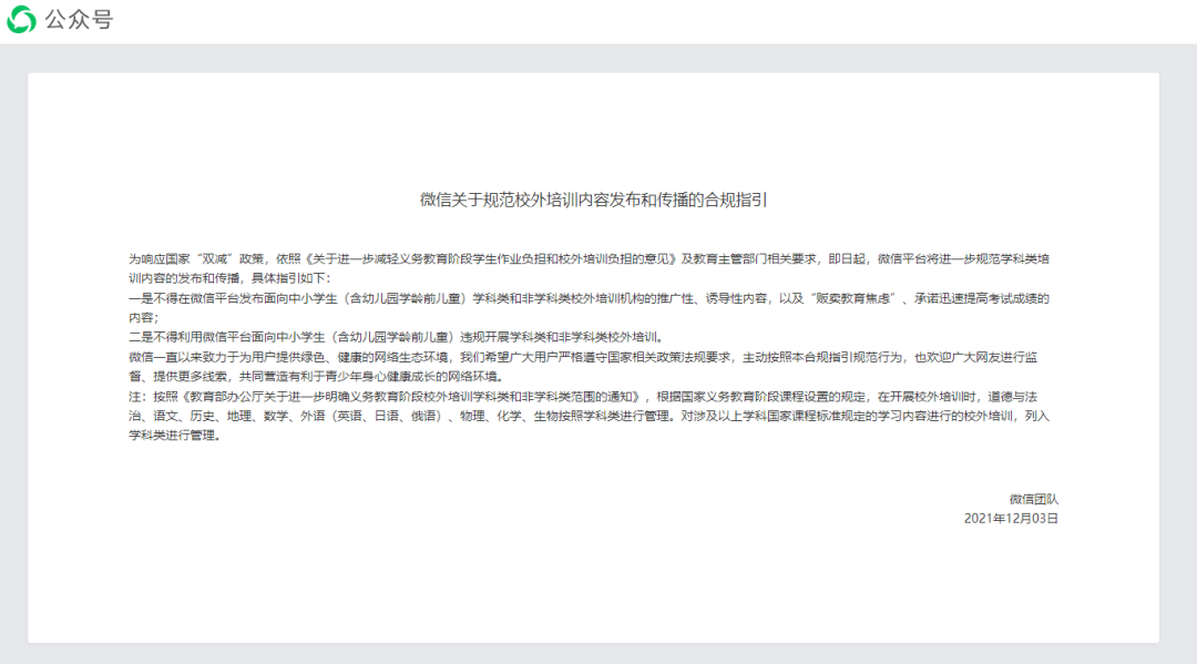 微信官网截图 同时,微信提到,按照《教育部办公厅关于进一步明确义务教育阶段校外培训学科类和非学科类范围的通知》,根据国家义务教育阶段课程设置的规定,在开展校外培训时,道德与法治、语文、历史、地理、数学、外语(英语、日语、俄语)、物理、化学、生物按照学科类进行管理。对涉及以上学科国家课程标准规定的学习内容进行的校外培训,列入学科类进行管理。 抖音官宣禁止 抖音电商运营团队于11月19日发布公告,称将禁止发布面向学龄前儿童的课程以及面向中小学(含高中)的学科类课程;面向中小学(含高中)的非学科类课程,只允许发布在“教育培训-中小幼培训-儿童兴趣”类目。 11月9日发布的《关于做好校外培训广告管控的通知》规定,不区分学科类、非学科类,要确保做到主流媒体及其新媒体、网络平台以及公共场所、居民区等线上线下空间不刊登、不播发面向中小学(含幼儿园)的校外培训广告。 同时还提到,要将校外培训广告管控纳入互联网信息管理的重点内容,对于违反政策代理、制作、刊登、播发校外培训广告的电商平台和其他互联网企业,要坚决依法处置。 来源:生活报 责任编辑:党安宁 / 编审:邓植元