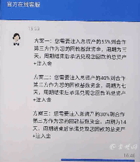 进群后,吴先生发现群里有100多名受害人,有人投资了几十万都血本无归,但令人欣慰的是,每天都有人发“维权成功的案例和截图”,吴先生仿佛看到了希望,便在群里询问如何才能维权。 此时,群管理员给吴先生发了一个二维码,让他加“专属客服”进行一对一服务。专属客服询问了他的情况后,表示有3种方案可以返回损失。