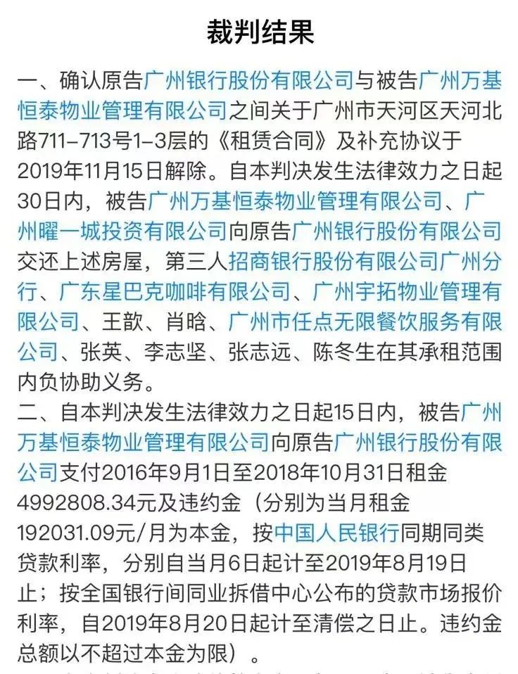 星巴克被卷入的相关案件 根据案件相关文书显示,由于万基恒泰、曜一城并未将天河北路711-713号1-3层(天河曜一城的一部分,产权为广州银行所有)的租金完全支付给广州银行,因此被广州银行提起诉讼。去年12月25日,广州市天河区人民法院判决广州银行胜诉。 据南都记者了解,由于星巴克曾在上述地址中租下铺面进行营业,因此与其他9个商户和个人作为“第三人”,被法院认为要在其承租范围内负协助义务。 南都记者还留意到,法院强制执行标的上,上述案件两名被告及其他第三人,均被强制执行同等数额的标的。 据了解,这已经是本月星巴克第二次遭遇风波。12月中旬,因被媒体曝光存在篡改保质日期售卖过期咖啡和食材等问题,星巴克陷入舆论“漩涡”,最终不得不为相关事件致歉,且关停和整改两家涉事门店。 来源:南方都市报 责任编辑:党安宁 / 编审:邓植元