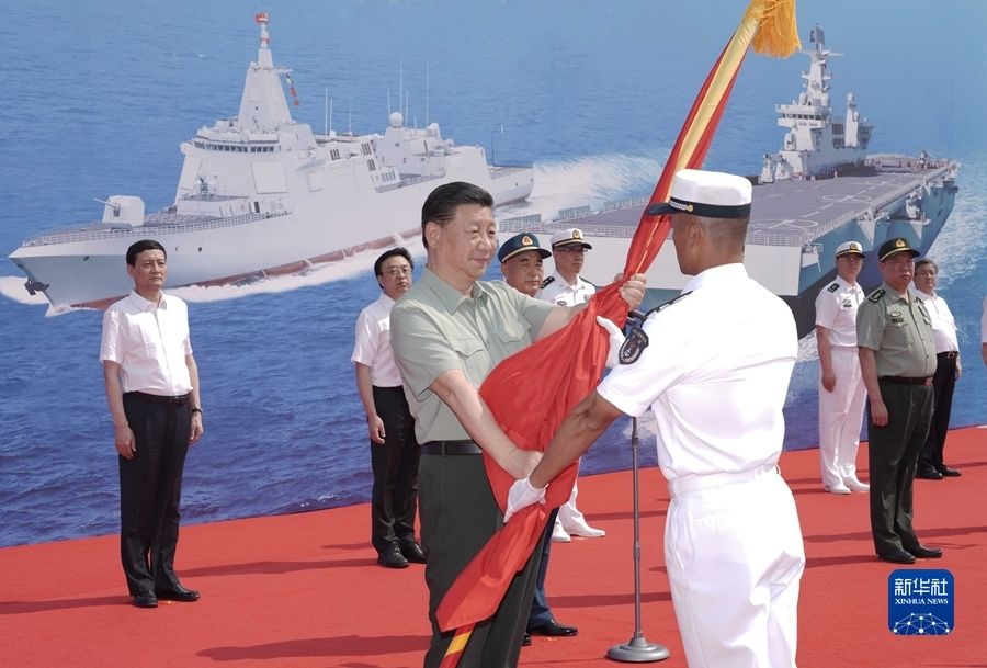 2021年4月23日,海军三型主战舰艇——长征18号艇、大连舰、海南舰在海南三亚某军港集中交接入列。中共中央总书记、国家主席、中央军委主席习近平出席交接入列活动并登上舰艇视察。这是习近平向长征18号艇授予军旗、命名证书。 新华社记者 李刚 摄