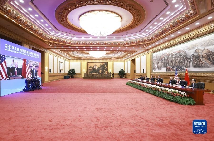 2021年11月16日上午,国家主席习近平在北京同美国总统拜登举行视频会晤。 新华社记者 丁林 摄