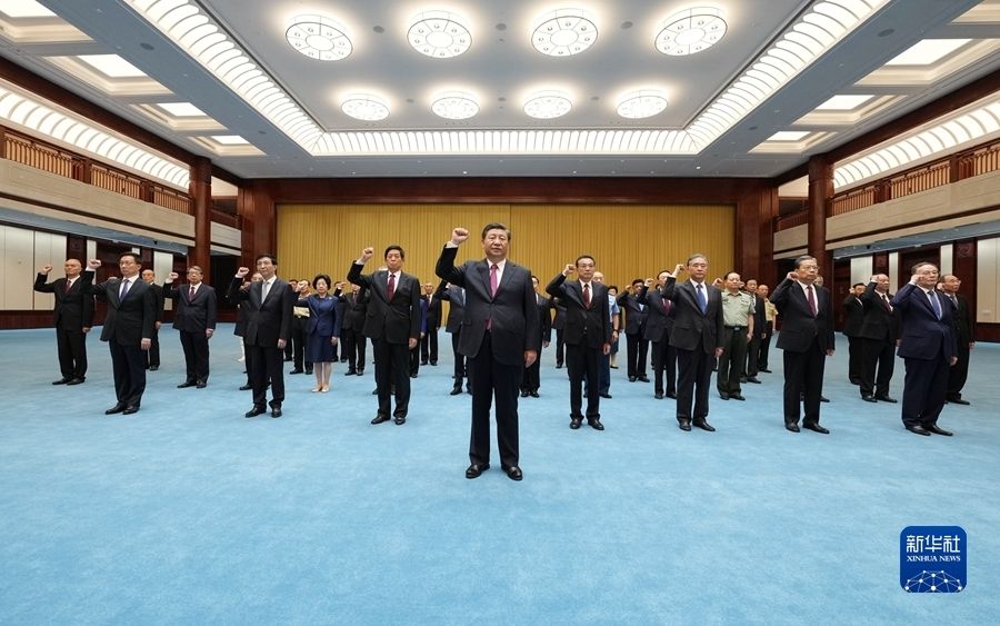 2021年6月18日,党和国家领导人习近平、李克强、栗战书、汪洋、王沪宁、赵乐际、韩正、王岐山等在中国共产党历史展览馆参观“‘不忘初心、牢记使命’中国共产党历史展览”。这是参观结束后,习近平带领党员领导同志一起重温入党誓词。 新华社记者 李学仁 摄