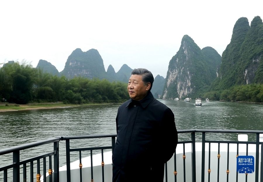 2021年4月25日至27日,中共中央总书记、国家主席、中央军委主席习近平在广西考察。这是25日下午,习近平在桂林市阳朔县,乘船考察漓江阳朔段。 新华社记者 鞠鹏 摄