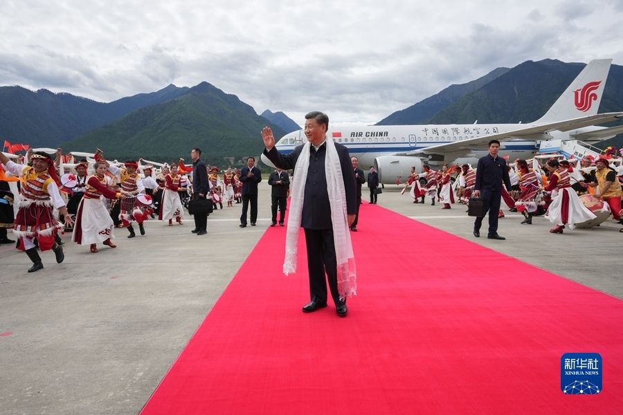 2021年7月21日至23日,中共中央总书记、国家主席、中央军委主席习近平来到西藏,祝贺西藏和平解放70周年,看望慰问西藏各族干部群众。这是21日上午,习近平乘坐飞机抵达林芝米林机场,西藏各族干部群众载歌载舞,热烈欢迎习近平总书记的到来。 新华社记者 李学仁 摄