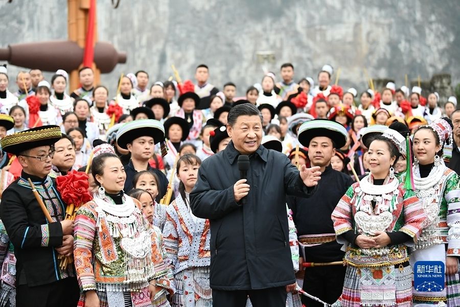 2021年2月3日至5日,中共中央总书记、国家主席、中央军委主席习近平来到贵州考察调研,看望慰问各族干部群众,向全国各族人民致以美好的新春祝福。这是3日下午,习近平在毕节市黔西县新仁苗族乡化屋村文化广场上,向全国各族人民、港澳台同胞和海外侨胞拜年。 新华社记者 谢环驰 摄