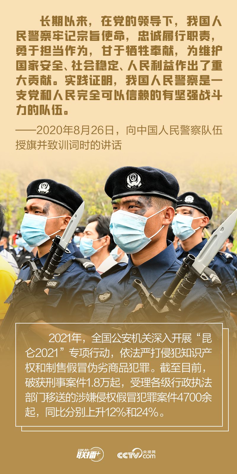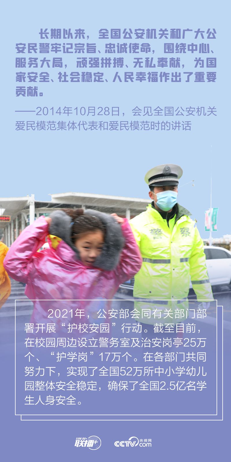 有这么一群人,他们奋战在共和国的大街小巷、山村哨卡、荒原戈壁,没有节假日,不分寒冬酷暑。 当危险来临,他们是冲在最前线的排头兵。 金色盾牌,热血铸就。 他们就是被誉为“人民卫士”的人民警察。 人民警察队伍是一支有着光荣传统和优良作风的队伍,也是和平年代牺牲最多、奉献最大的队伍。一直以来,习近平总书记非常关心这一群体,高度重视警察工作,新春考察时看望慰问坚守岗位一线的公安干警,会见全国公安机关爱民模范集体代表和爱民模范时向他们致以崇高敬意,向中国人民警察队伍授旗时致训词......一言一行,一字一句,浸润着总书记的关爱之情。 今年1月10日是第二个中国人民警察节,央视网《联播+》邀您一起聆听总书记温暖话语,致敬人民警察,共同建设安居乐业的平安中国。