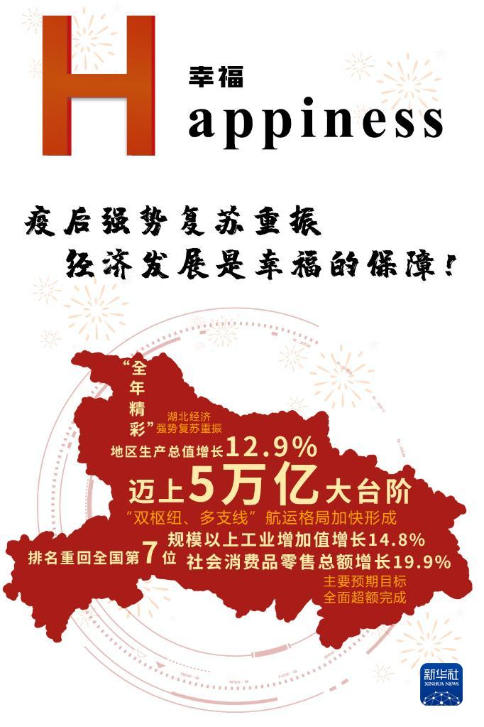 地区经济生产总值首次突破5万亿 GDP增长12.9% 重回全国第七 创历史新高 回望2021年 在疫后重振 极不平凡的关键年份 湖北跑出“加速度”重回“主赛道” 以“拼”“抢”“实”的作风 全面推进各项工作 年初主要预期目标全面超额完成 经济强势复苏重振 HUBEI 5个字母值5万亿—— 湖北邀你阅览“全年精彩”答卷