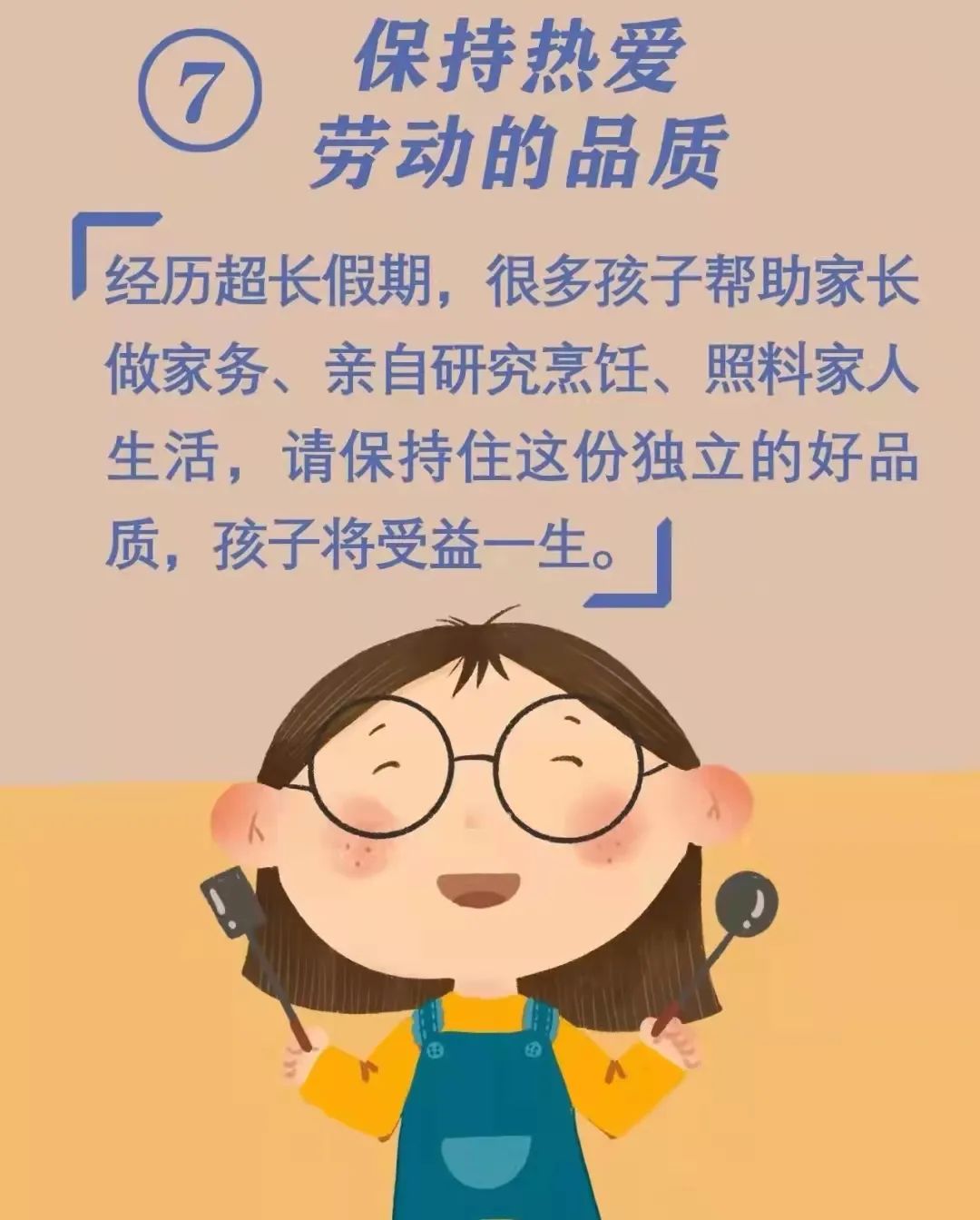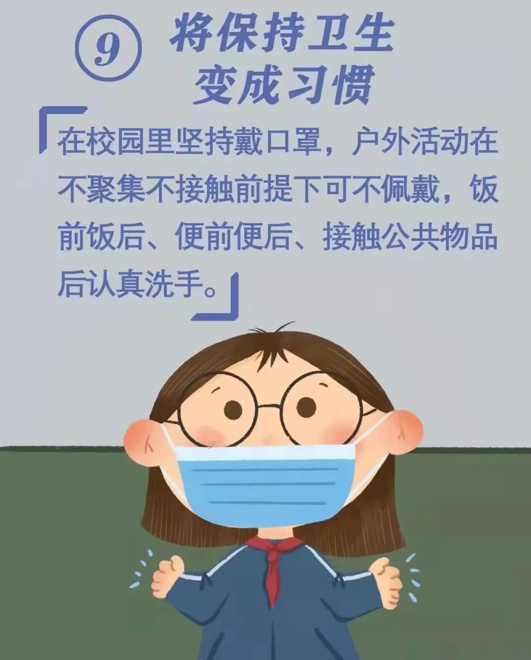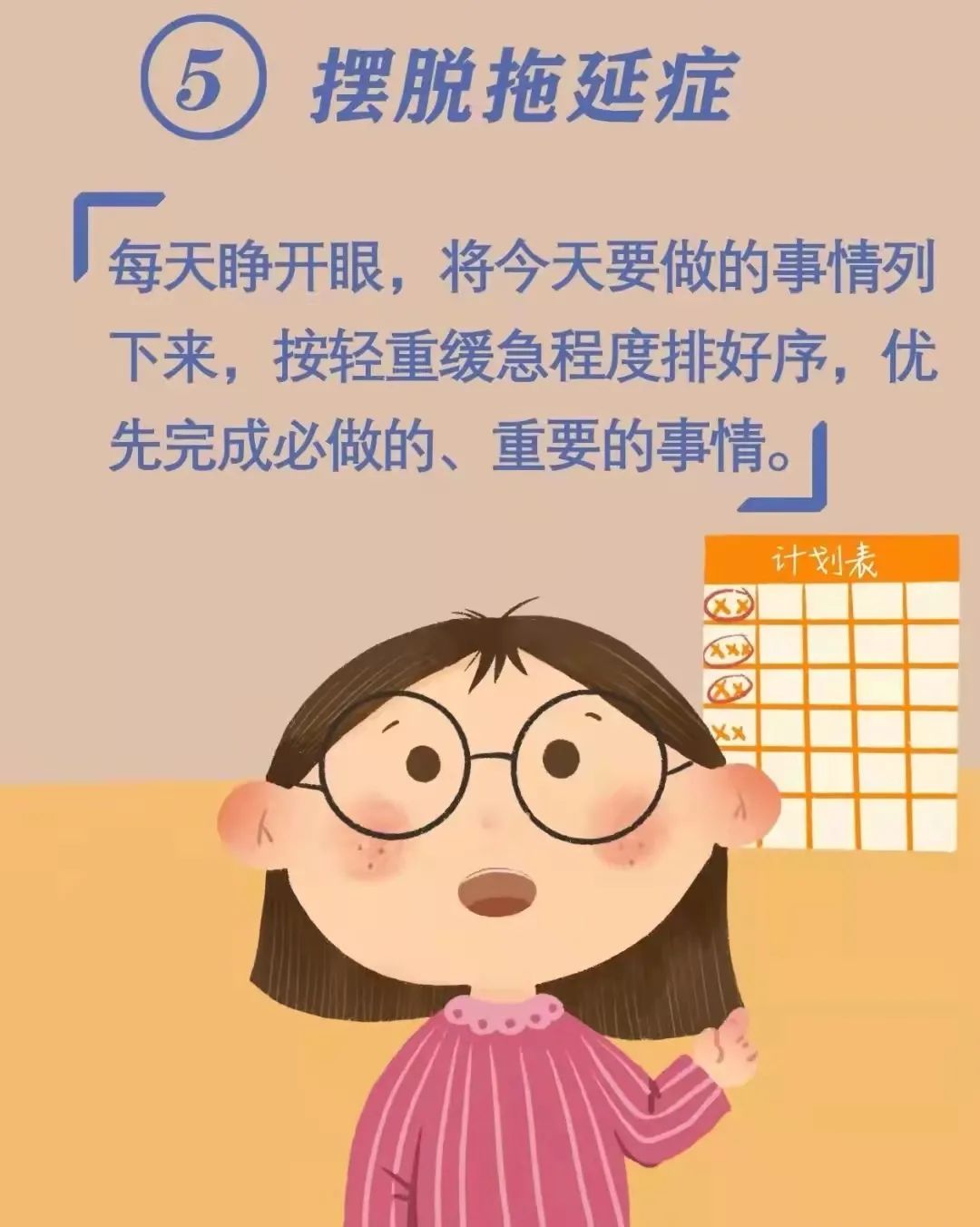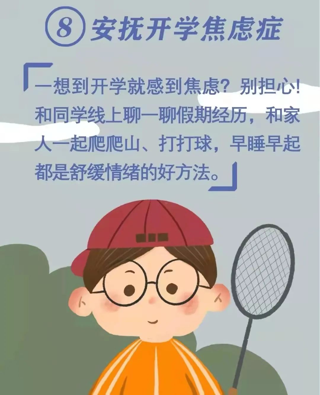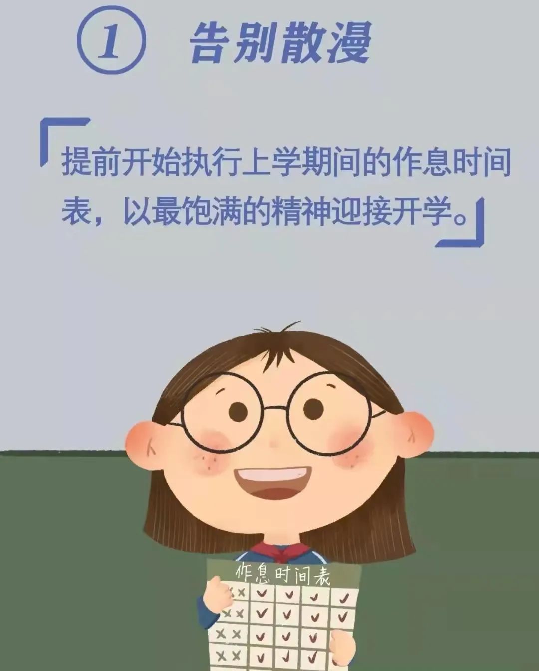 1、早上洗个冷水脸,激活存储在电池中剩余的电量。 2、利用课间,小口小口喝点水,补充大脑需要的“营养”——氧气。 3、课上犯困了,瞪大眼睛盯着老师,悄悄做几个深呼吸,给快要“耗竭”的大脑再次补“氧”。 4、午休时间,赶快趴一会,要知道午间10分钟高质量休整可以抵得上晚上1小时的睡眠! 5、课间不要奔跑,在走廊上多呼吸一些新鲜空气,极目远眺,放松紧绷的神经,减少身体和大脑的损耗。 6、这一点特别重要,就是晚上一定要早点睡,争取早点充上第二天的电,保证第二天可以“满电”上学。 02 适应不了开学快节奏怎么办? 悄悄告诉大家,这个担心没必要,因为第一周老师们都会放慢脚步,以帮大家适应开学的新生活,这个“慢”就是为了让同学们可以逐渐调整好自己的学习状态。所以,想要跟上学校的学习节奏,大家记得要抓住第一、第二周的“黄金适应周”来调整自己。这里再给大家几个小妙招: 1、早睡早起。低年级的同学不要迟于8点上床睡觉,中高年级的同学最迟最迟不要超过9点睡觉,最好8点30分之前就可以上床睡着。 2、早、中、晚饭要吃好。人是铁饭是钢,一顿不吃饿得慌。同学们每天都要保证自己吃嘛嘛香哦!这样你的身体营养才能跟上你的节奏,保证你一天的学习生活。 3、每天运动要跟上。运动可以让我们的大脑更灵活,让我们的身体更健康,所以体育课、大课间这些运动时间要好好利用。 4、抓紧在校时间写作业。中午、下午都有作业时间,这个时间要抓住,争取把作业都写完,这样回家后,你只要做些复习、预习的工作就可以好好玩一会睡觉了。