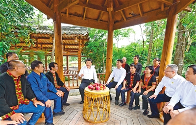 4月10日至13日,中共中央总书记、国家主席、中央军委主席习近平在海南考察。这是11日下午,习近平在五指山市水满乡毛纳村,同当地干部群众亲切交谈。 新华社记者 李学仁 摄