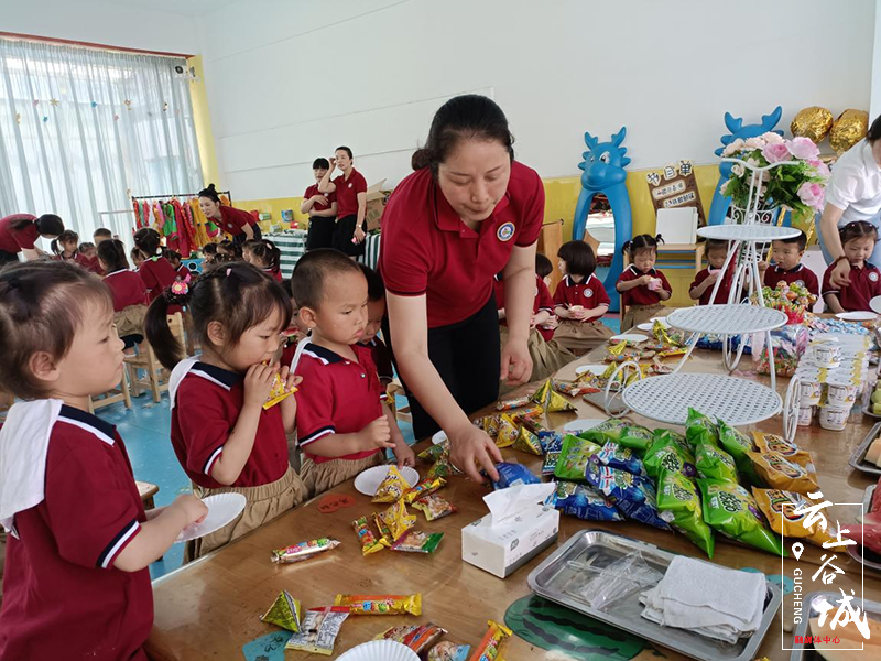 庆六一。活动以三个篇章拉开帷幕,第一篇章“师幼同唱”,以儿童节、端午节和爱国主义教育为主旋律,采用节目表演的形式进行朗诵诗歌、歌曲表演、红歌吟唱等;第二篇章“师幼同乐”,以有趣的游戏为主,在游戏中培养孩子拼搏、合作的团队意识,增强班级凝聚力;第三篇章“师幼同享”,幼儿园为孩子们准备了蛋糕、水果、零食等,通过美味分享、共同品尝,享受快乐童年。