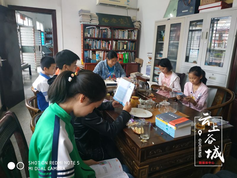 社员在杜权成图书馆阅读书籍 五山镇中心学校玉皇剑文学社成立于2000年9月,2017年更名山茶花文学社。2001年,获得湖北省首届中学生优秀文学社团评比一等奖,2002年,襄阳市教研室为了推广五山经验,在谷城召开襄阳市首届中学生文学社团经验交流会。2005年,入选全国中学生文学社团联盟核心期刊。