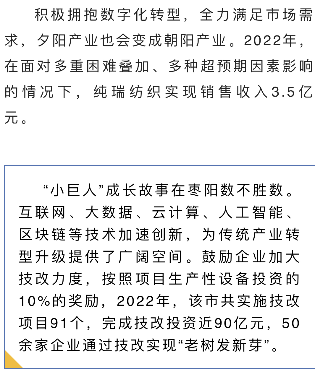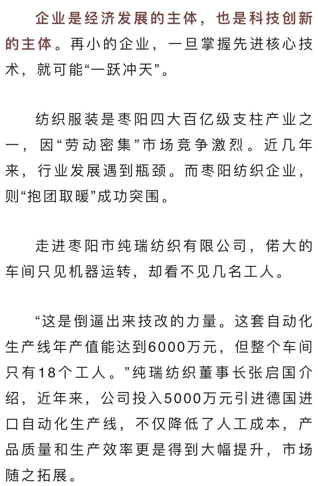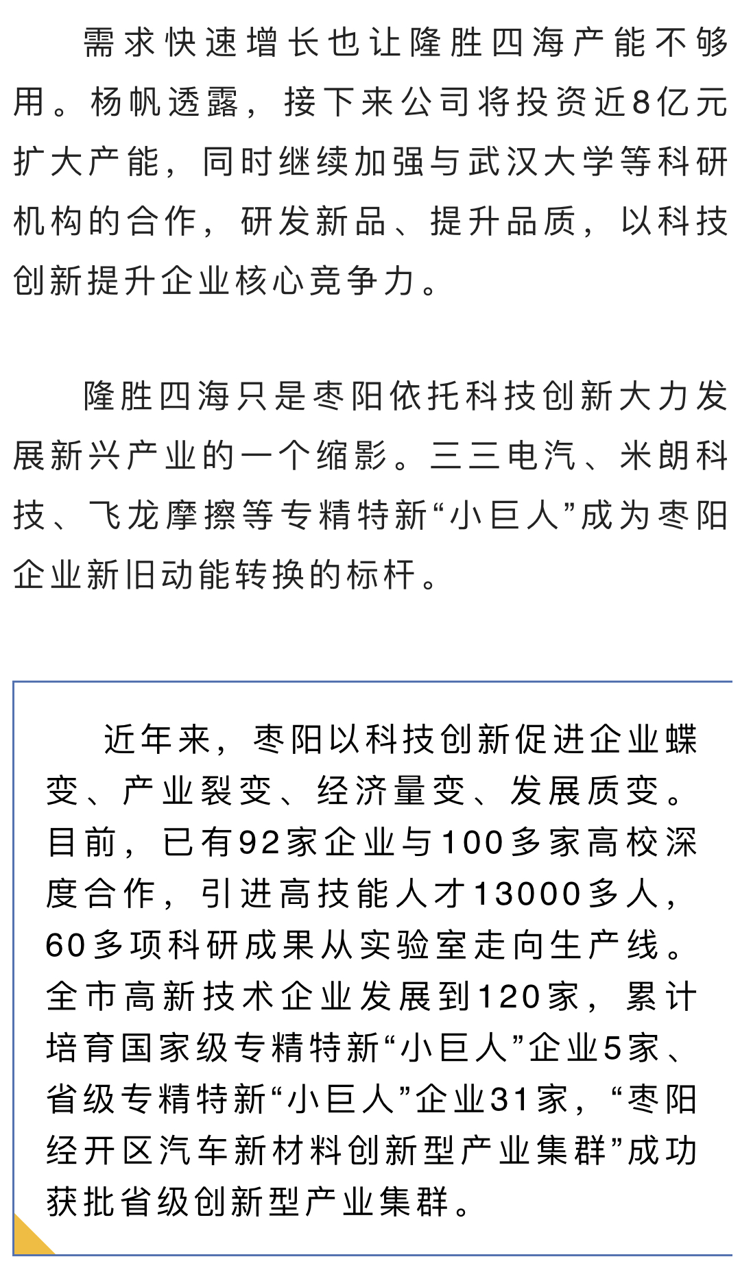 围绕“加快襄阳市域副中心城市建设,做强襄阳都市圈高质量发展东翼支撑”定位,枣阳锚定更高目标:2023年,力争地区生产总值突破900亿元,工业总产值突破1200亿元,在全国百强县中持续进位。 襄阳市委常委、枣阳市委书记孟艳清说 以创建国家级创新型县市为抓手,大力实施创新型领军企业培育行动、高新技术企业“倍增计划”、科技型中小企业成长行动和独角兽、瞪羚企业培育工程,全力推动产业向高端化、智能化、绿色化方向发展,加快建设区域性现代产业中心。 号角声声,催人奋进。 春节刚过,尽管天气依然寒冷,但枣阳工业园区热气腾腾。 2月20日,位于国家级经济技术开发区的湖北隆胜四海新材料股份有限公司(以下简称“隆胜四海”)自动化生产线24小时加班生产。