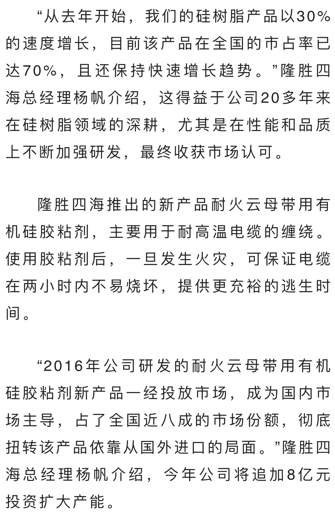 隆胜四海主要从事有机硅系列产品的研发、生产和销售,是国家火炬计划重点高新技术企业、国家知识产权优势企业、国家专精特新小巨人企业、湖北省支柱产业细分领域科技小巨人企业。 隆胜四海的龙头产品是硅树脂化工产品,该原料具有耐温、绝缘、防腐等功能,广泛应用于新能源电池的生产,为电池包提供绝缘、阻燃服务。近年来,随着新能源电池行业增长迅猛,隆胜四海的硅树脂产品也需求大增。
