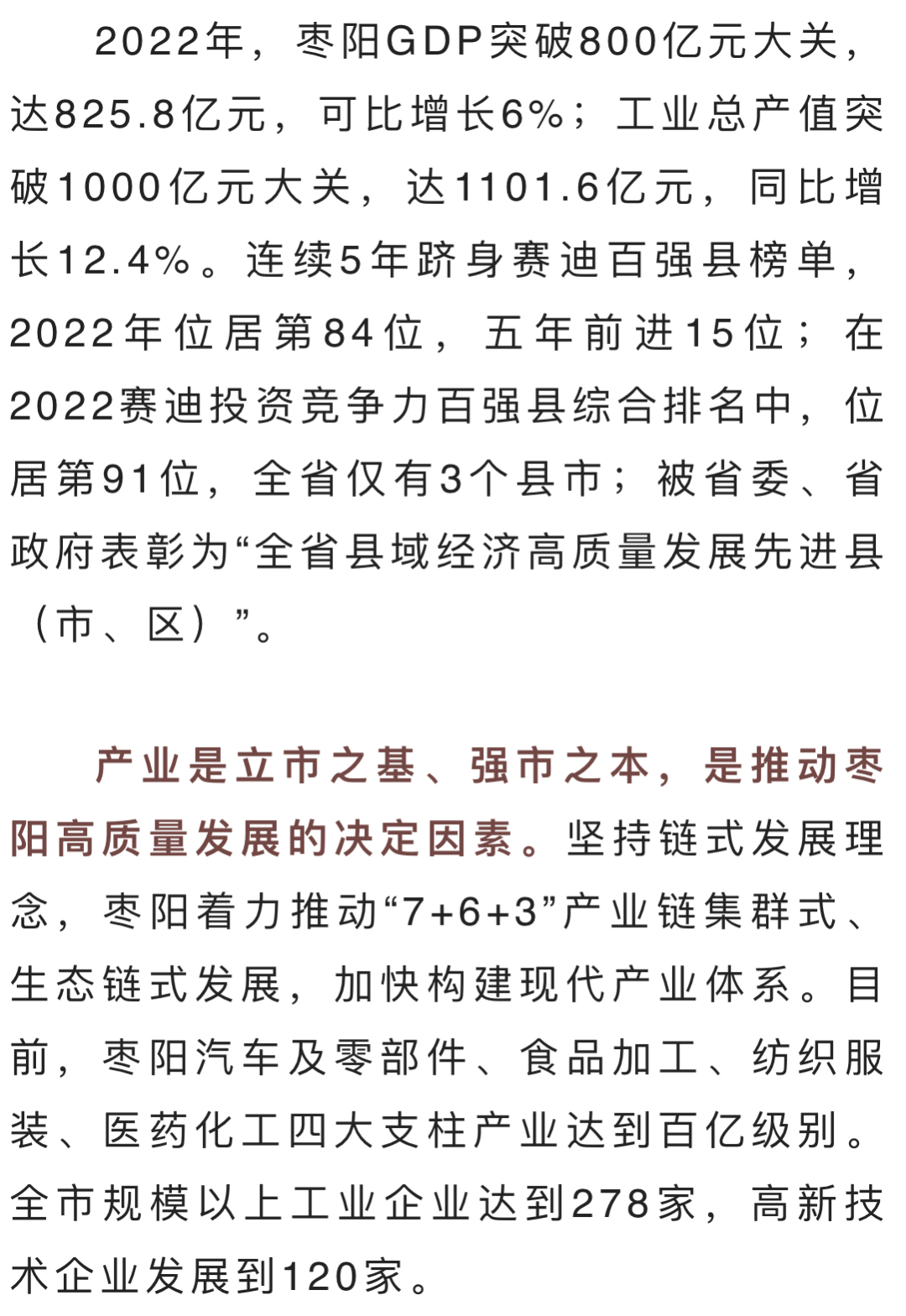 催人奋进马蹄急,春光正浓东风劲 “全国百强”枣阳市,激流澎湃奔涌 2月8日,枣阳市进行2023年一季度“开门红”暨重大项目“集中签约、开工及竣工”活动,集中签约、开工及竣工的项目共有33个,计划总投资320.35亿元。其中,新签约11个,计划总投资58.4亿元;新开工项目8个,总投资37.65亿元。 2月9日,枣阳市“四大家”领导带领11路招商专班百余名招商干部又出征。 随着投资110亿元的华能抽水蓄能一体化能源项目、投资109亿元的华润大力风电钒液流电池产业园项目等一批百亿级项目落户,今年,枣阳力争全年引进亿元以上工业项目130个,合同投资额900亿元以上,加快襄阳市域副中心城市建设,做强襄阳都市圈高质量发展东翼支撑,奋力谱写中国式现代化枣阳篇章。 ![]()