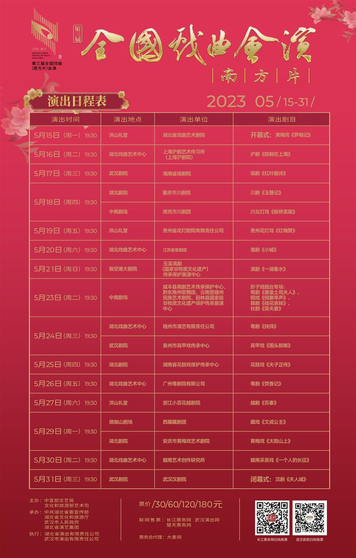 好戏连台,尽展戏曲之美;名家云集,共襄艺术盛宴。 5月15日起,由中宣部文艺局、文化和旅游部艺术司主办,湖北省委宣传部、湖北省文化和旅游厅、武汉市人民政府、湖北省演艺集团承办,湖北省演出有限责任公司、武汉市演出有限责任公司执行的第三届全国戏曲(南方片)会演活动将重磅登陆武汉这座“戏码头”。