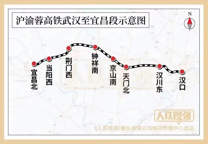 沪渝蓉高铁线路总长约2100公里,途经上海、江苏、安徽、湖北、重庆、四川等六省市。沪渝蓉高铁武汉至宜昌段位于湖北省境内,起自武汉市,经天门市、荆门市,终至宜昌市,正线全长313公里,设汉口(既有)、汉川东、天门北、京山南、钟祥南、荆门西、当阳西、宜昌北8座车站。 沪渝蓉高铁武汉至宜昌段东连沪渝蓉沿江高铁合肥至武汉段,西接沪渝蓉沿江高铁宜昌至涪陵段,在武汉枢纽与合武、武九等高铁衔接,在宜昌通过在建的宜昌至兴山高铁与郑渝高铁相连。