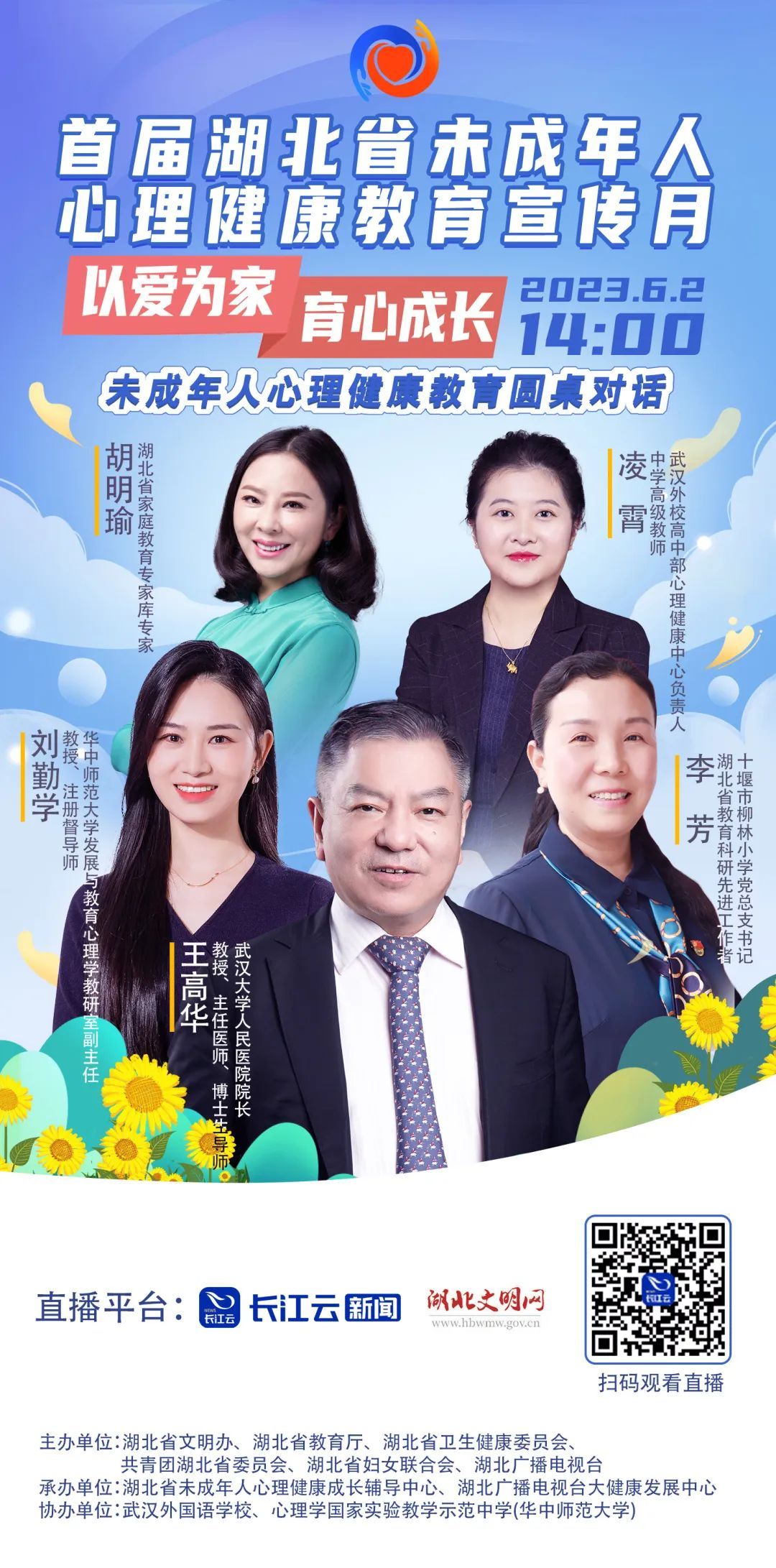 6月2日,湖北省未成年人心理健康成长辅导中心将邀请专家与心理健康教师、家长面对面研讨交流,以“以爱为家 育心成长”为主题,组织“心理健康教师、家长与专家圆桌对话”活动,聚焦心理健康教育与健康人格、心理健康教育与家庭教育等主题,一起探讨未成年人的健康成长中的家庭环境的角色与作用,为未成人年的心理健康成长保驾护航。 活动时间及地点 2023年6月2日 14:00 武汉外国语学校 直播平台 长江云新闻APP “文明湖北”公众号 探讨话题 01. 家庭教育与未成年人 心理健康教育的关系 02. 信息时代 家庭教育面临哪些独特的挑战 03. 如何从家庭层面 促进未成年人的心理健康教育 专家介绍 王高华 教授、一级主任医师、博士生导师、高级心理咨询师。湖北省医学领军人才、国务院特殊津贴专家。现任武汉大学人民医院院长、湖北省精神卫生中心学科带头人。 刘勤学 教授、中国心理学会注册督导师、湖北省精神文明建设指导委员会办公室未成年人心理健康专家库首批特聘专家。现任华中师范大学心理学院发展与教育心理学教研室副主任、湖北省心理学会副秘书长。 李芳 中学高级教师、湖北省教育科研先进工作者、湖北省三八红旗手、二级心理咨询师。现任十堰市柳林小学党总支书记。 胡明瑜 湖北省家庭教育专家库专家、湖北省家庭教育研究会理事。现任本尚书院院长。 凌霄 中学高级教师、二级心理咨询师,现任武汉外校(高中部)心理健康中心负责人。 观看方式一 进入“文明湖北”微信公众号 点击菜单“圆桌对话”观看直播