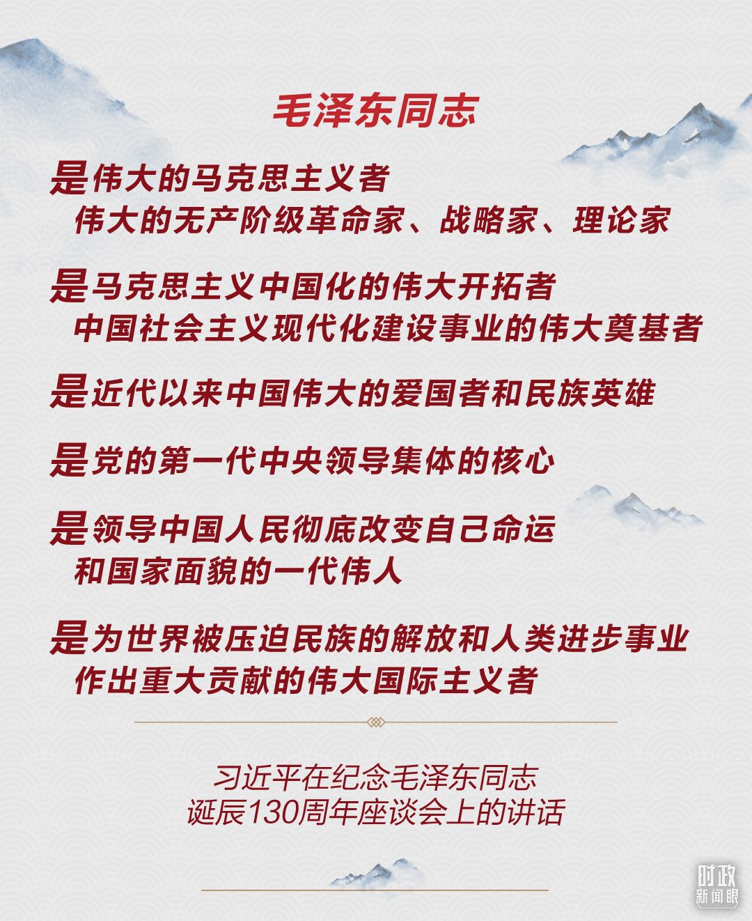 今年12月26日,是毛泽东同志诞辰130周年纪念日。当天上午,中共中央在人民大会堂举行座谈会,纪念毛泽东同志诞辰130周年。习近平总书记发表重要讲话。 总书记在座谈会上说,“对毛泽东同志的最好纪念,就是把他开创的事业继续推向前进。”如何推进这一伟大事业?总书记提出了明确要求,《时政新闻眼》为你解读。 01“最好的纪念” 一代伟人的诞辰纪念,连接着历史、现在和未来。 10年前的这一天,2013年12月26日,习近平总书记出席了纪念毛泽东同志诞辰120周年座谈会。他说,“一切向前走,都不能忘记走过的路;走得再远、走到再光辉的未来,也不能忘记走过的过去。” 相隔10年,在两场座谈会的讲话中,总书记都高度评价了毛泽东同志的丰功伟绩。 《时政新闻眼》注意到,与10年前的讲话相比,总书记在今年这次座谈会上增加了两个新的表述:毛泽东同志是“中国社会主义现代化建设事业的伟大奠基者”,“是为世界被压迫民族的解放和人类进步事业作出重大贡献的伟大国际主义者”。