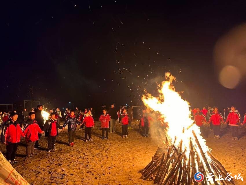 晚会现场,篝火簇簇,乐鼓震天。学校师生围着篝火,手拉着手唱起了歌曲《明天会更好》,跳起了即兴篝火舞。