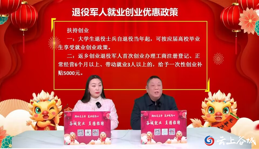 “这位战友好!您退伍后想学点技术,政策上有优惠,可按规定参加一次免费技能培训,享受培训期间生活补贴。如果您在部队服役期间荣立两次三等功或在三类以上艰苦边远地区、海岛服役 5 年以上的,还可以增加一次免费培训。”针对一网友“退伍想学点技术,有没有优惠政策?”的提问,谷城县退役军人事务局移交安置股股长陈安国作了深入浅出地解答。这是1月26日,笔者在谷城县2024年“春风行动”暨就业援助月行动网络直播招聘会直播现场看到的一幕。