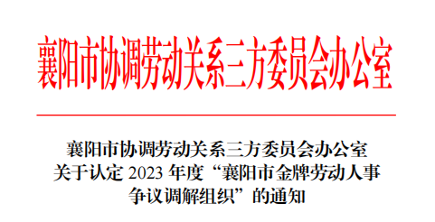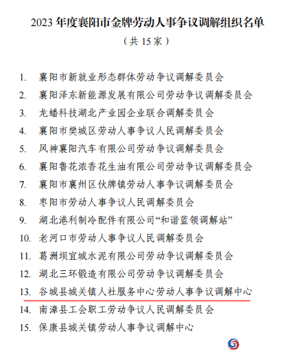 近日,谷城县城关镇人社中心获2023年度“襄阳市金牌劳动人事争议调解组织”荣誉称号。