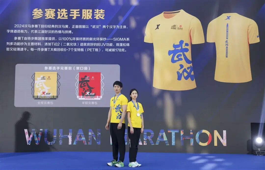 2024武汉马拉松的参赛T回归经典的汉马黄,正面图案以“武汉”两个汉字为主体,字体遒劲有力,代表江湖好汉的热情与拼搏。参赛T以100%环保材质的新光环保纱——SIGMA系列多功能纱为主要材料,添加TiO₂(二氧化钛)造就良好的抗UV功能,既蓬松绵密又轻薄速干。每一件参赛T大概回收6—7个宝特瓶(PET瓶),可减碳178克。