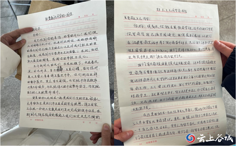 “解放军叔叔给我回信啦!” 2024年2月26日,开学第一天,谷城县紫金镇初级中学七(1)班的王文元、曹鑫怡两位同学收到来自新疆边防战士的回信。