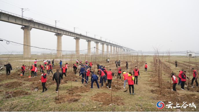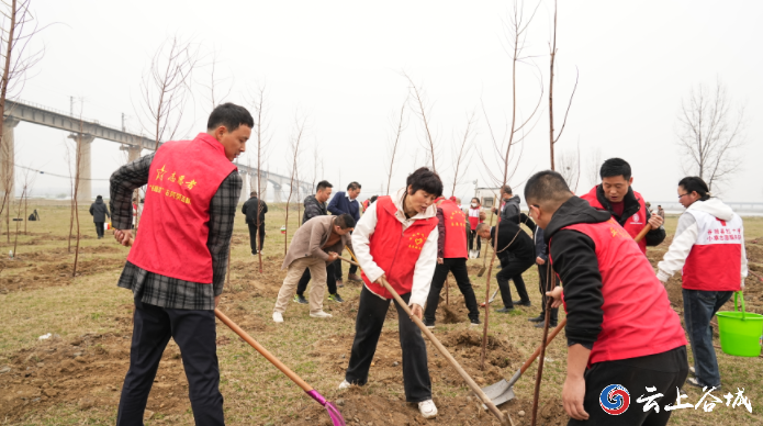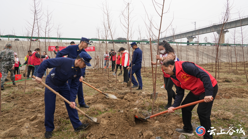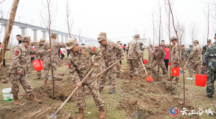 部队官兵、消防战士、城关镇民兵和志愿者们共150余人早早来到格垒嘴村汉江边的植树点,他们手持铁锹、锄头、水桶等工具,精神抖擞地投入到植树活动中,挥锹铲土、扶正树苗、填土浇水……大家干劲十足、配合默契,一片热火朝天的忙碌景象。