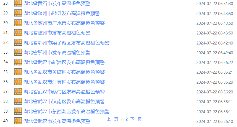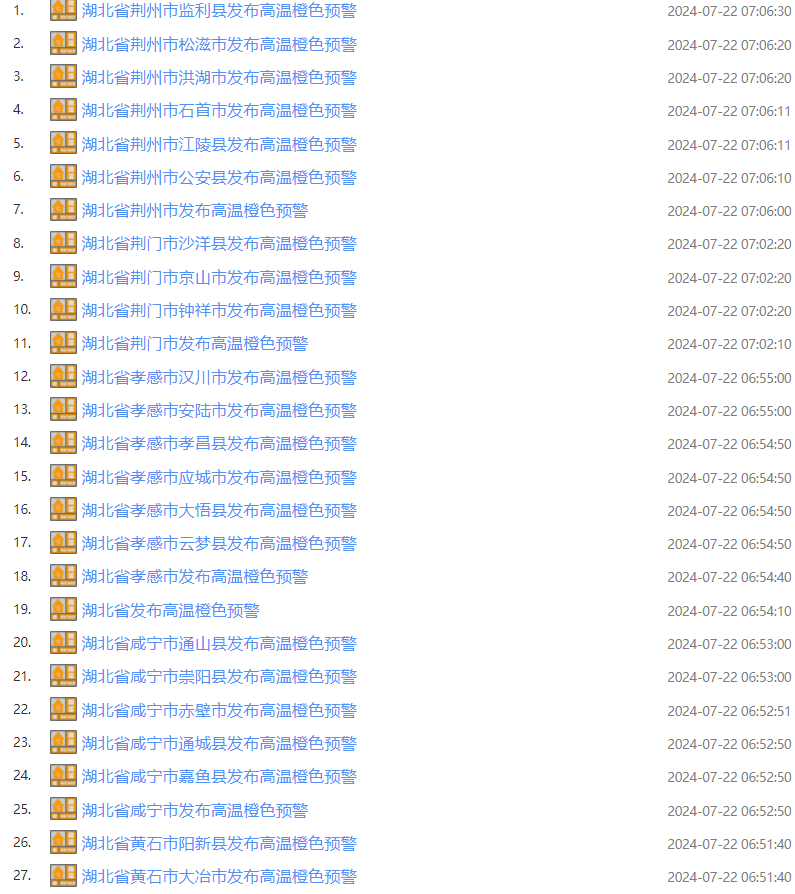 武汉中心气象台2024年07月22日06时54分发布高温橙色预警:预计今天白天,除神农架、恩施高海拔地区外,全省大部分地区最高气温将升至 37℃以上,局地超过39℃,请注意防范。 截至22日7时15分,湖北已发布40条预警。