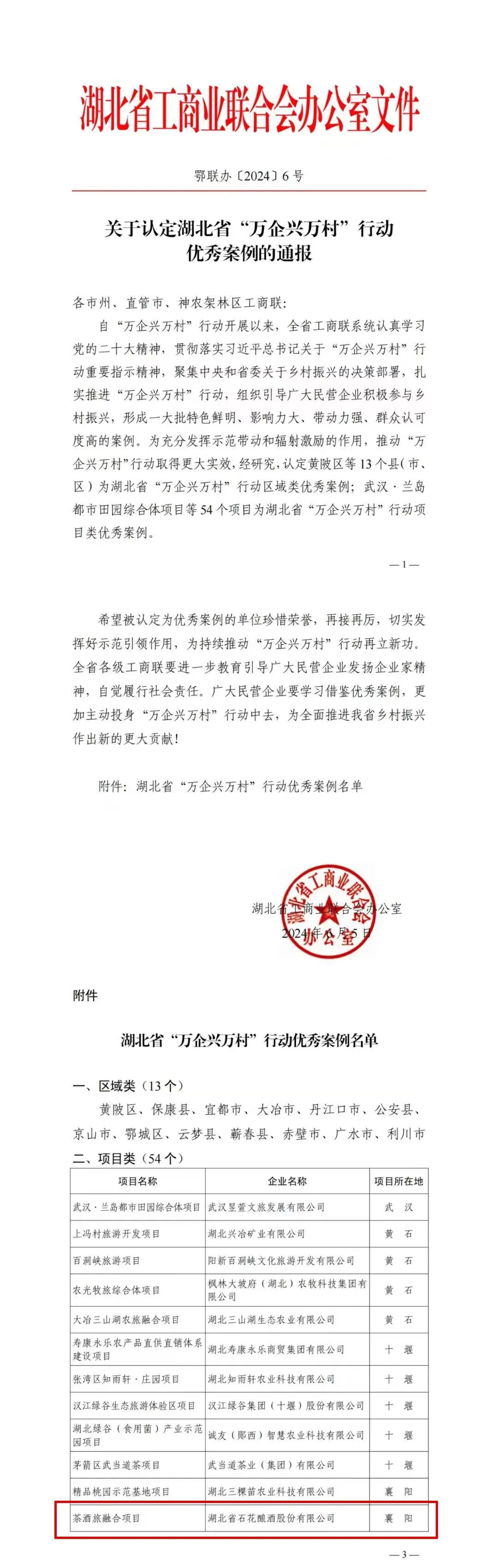 近日,湖北省工商业联合会办公室下发《关于认定湖北省“万企兴万村”行动优秀案例的通报》,认定13个县(市、区)为湖北省“万企兴万村”行动区域类优秀案例,54个项目为湖北省“万企兴万村”行动项目类优秀案例。其中,湖北石花酒业“茶酒旅融合”项目被认定为湖北省“万企兴万村”行动优秀案例。