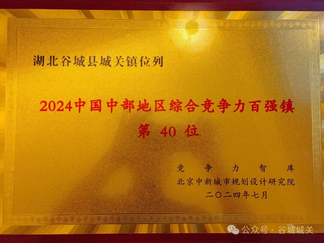 7月27日,2024乡镇高质量发展交流会在湖南省长沙县黄花镇举办。会上,竞争力智库发布了《中国乡镇综合竞争力报告2024》,《报告》同时公布了2024中国综合竞争力百强镇、2024中国中部地区综合竞争力百强镇、2024中国西部地区综合竞争力百强镇名单。其中,谷城县城关镇上榜2024中国中部百强镇名单,位列40名,较上年度进位2名。