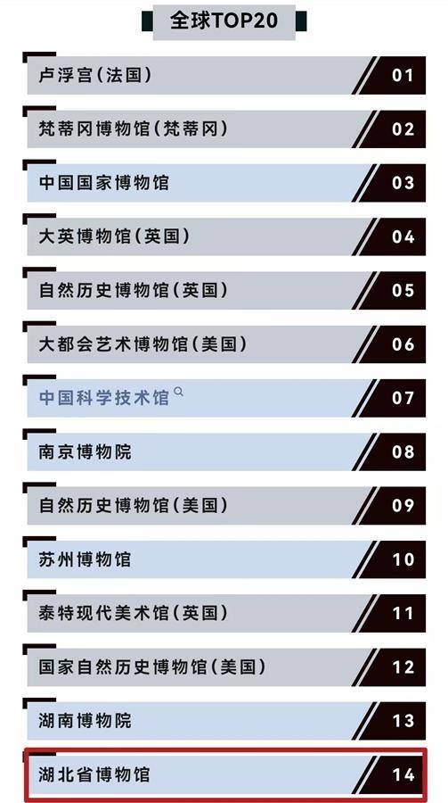 近日,世界主题乐园权威研究机构TEA与美国AECOM集团联合发布《2023年主题公园和博物馆报告:全球主要景点游客报告》。报告显示,中国共7家博物馆上榜全球前20,包括:中国国家博物馆、中国科学技术馆、南京博物院、苏州博物馆、湖南博物院、湖北省博物馆、广东省博物馆。湖北省博物馆位列第14位。