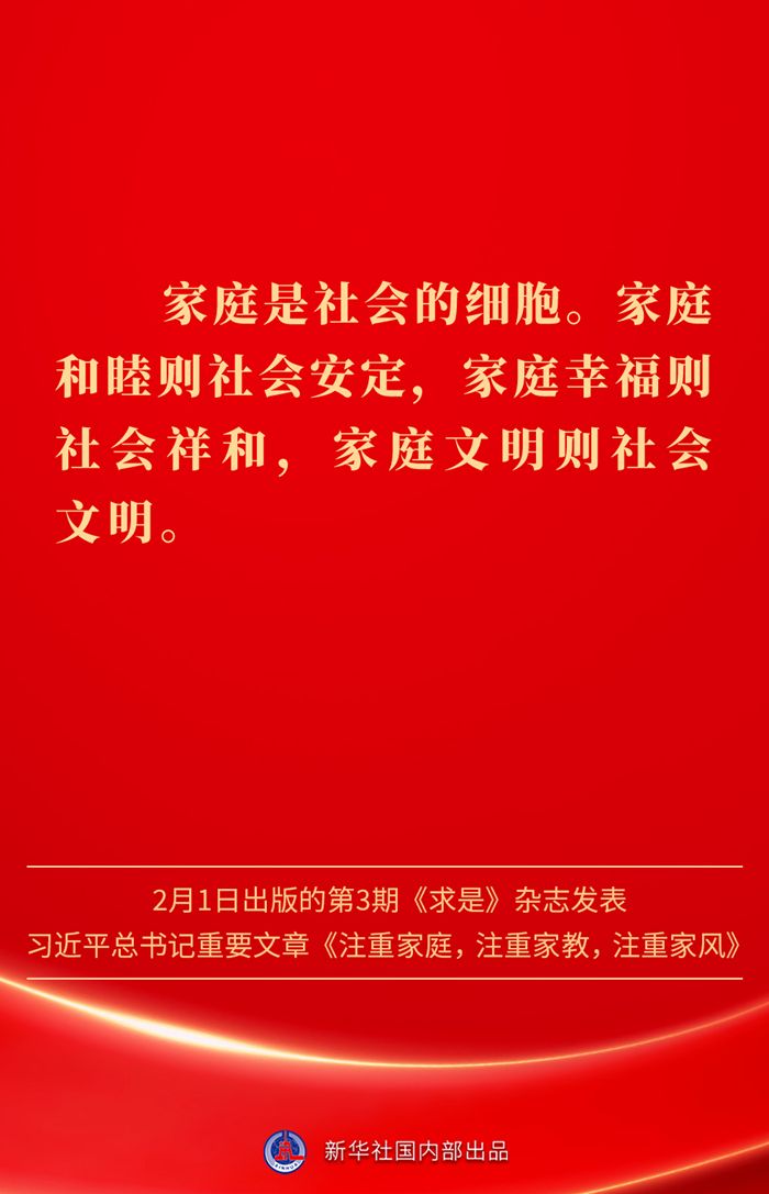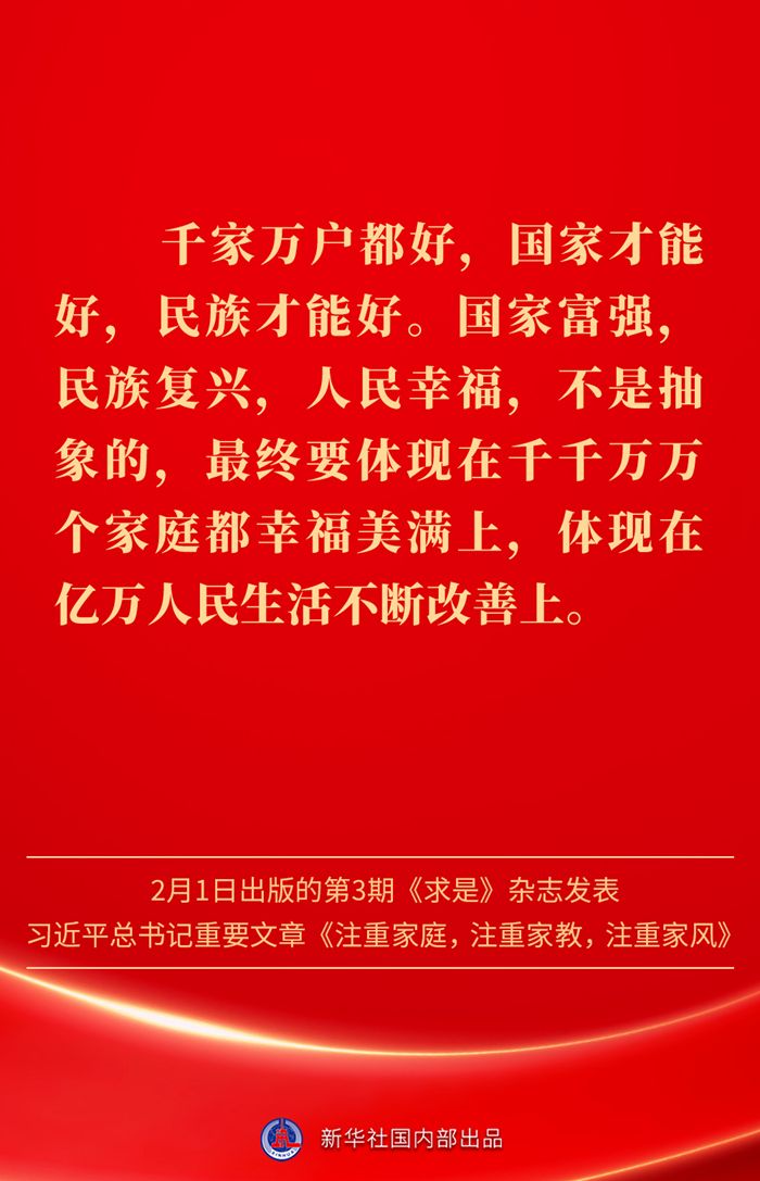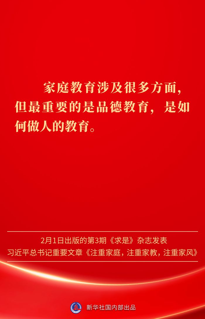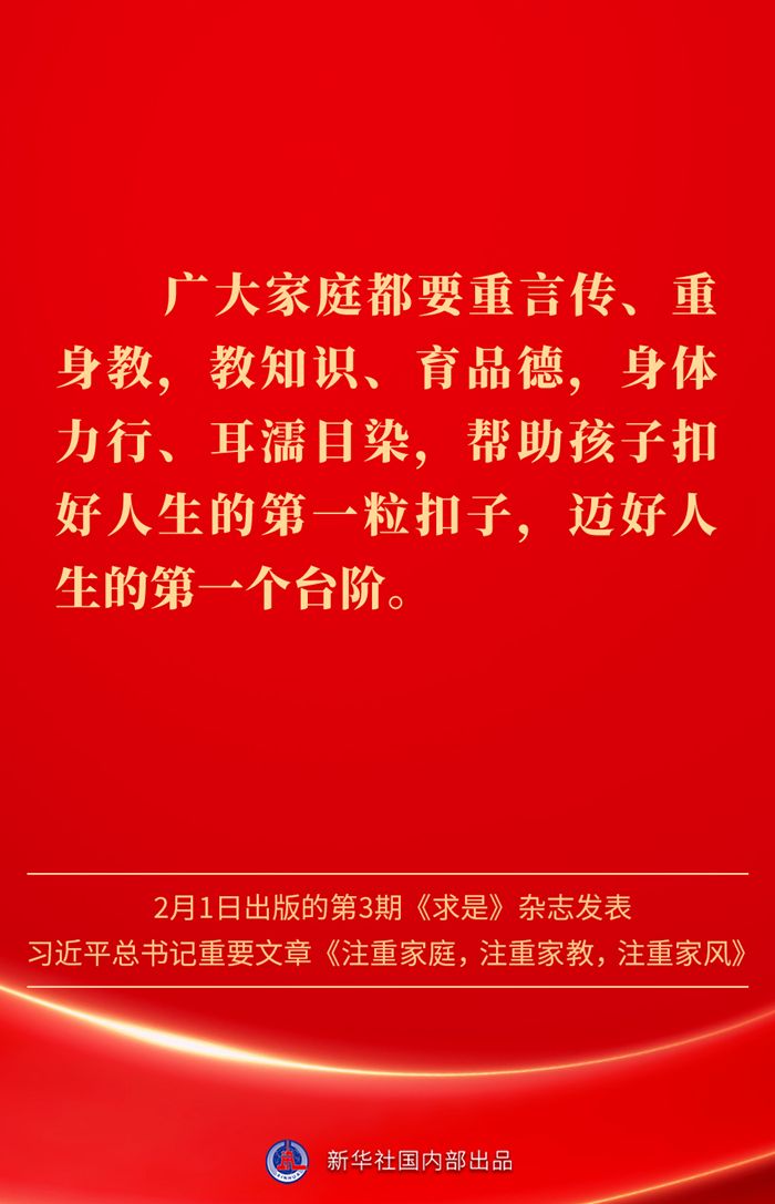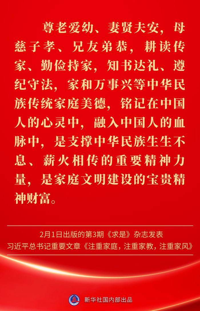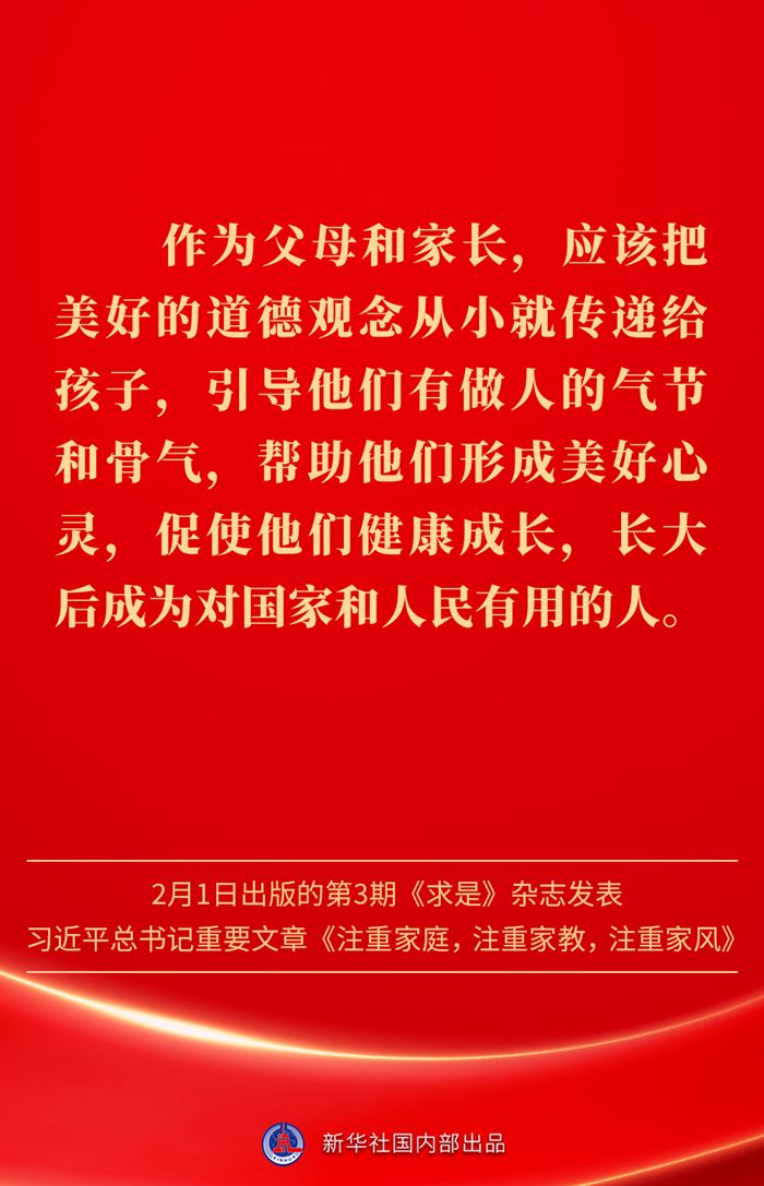金句|新春佳节,感悟总书记对家庭、家教、家风的重视 发布日期: 2025-02-03 字体:【大 中 小】 万家团圆共庆新春佳节之际,2月1日出版的第3期《求是》杂志发表习近平总书记重要文章《注重家庭,注重家教,注重家风》。为什么要注重家庭、家教、家风?如何做好家庭文明建设?习近平总书记这样阐述—— 来源:新华社 编辑:詹丽|审核:余运超 琚晓青 作者:云上谷城 【关闭本页】 【打印本页】