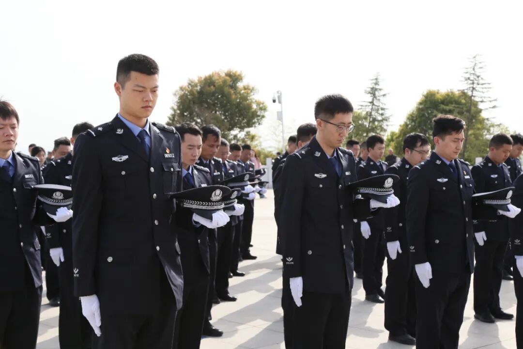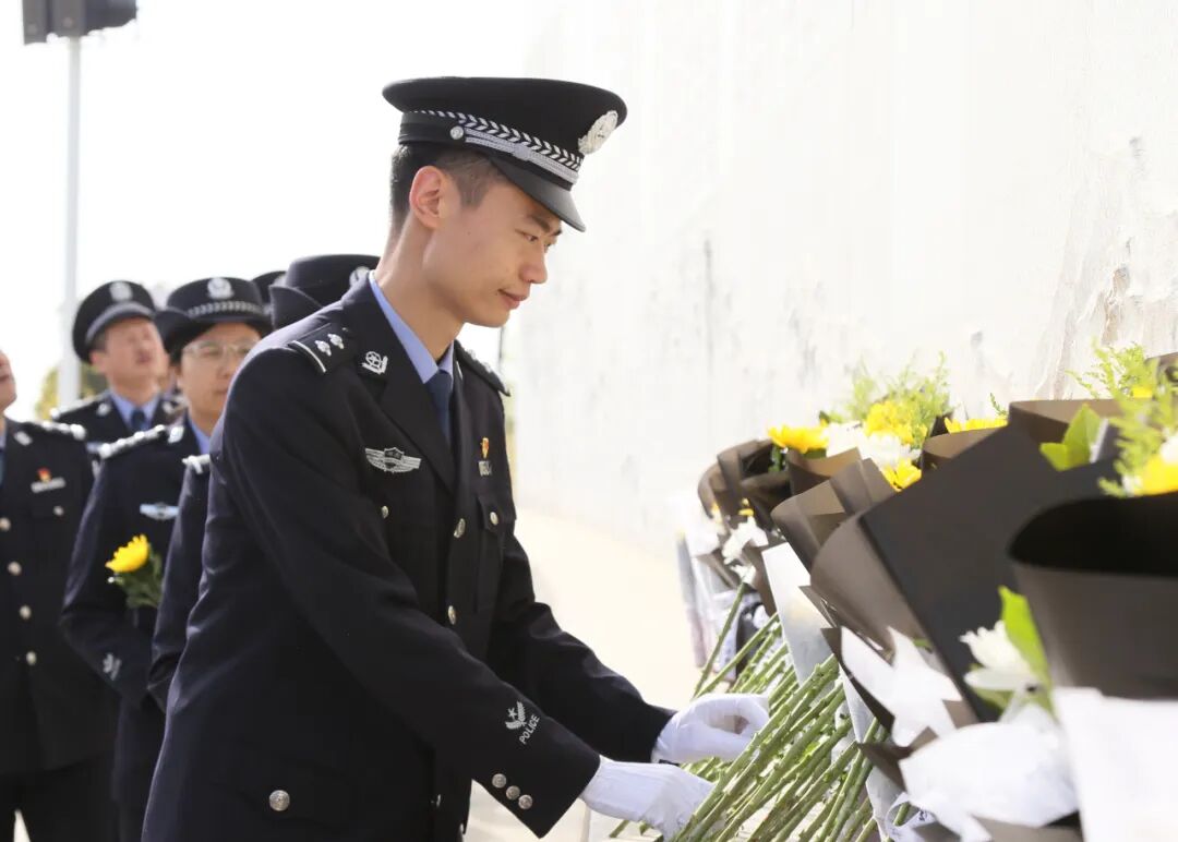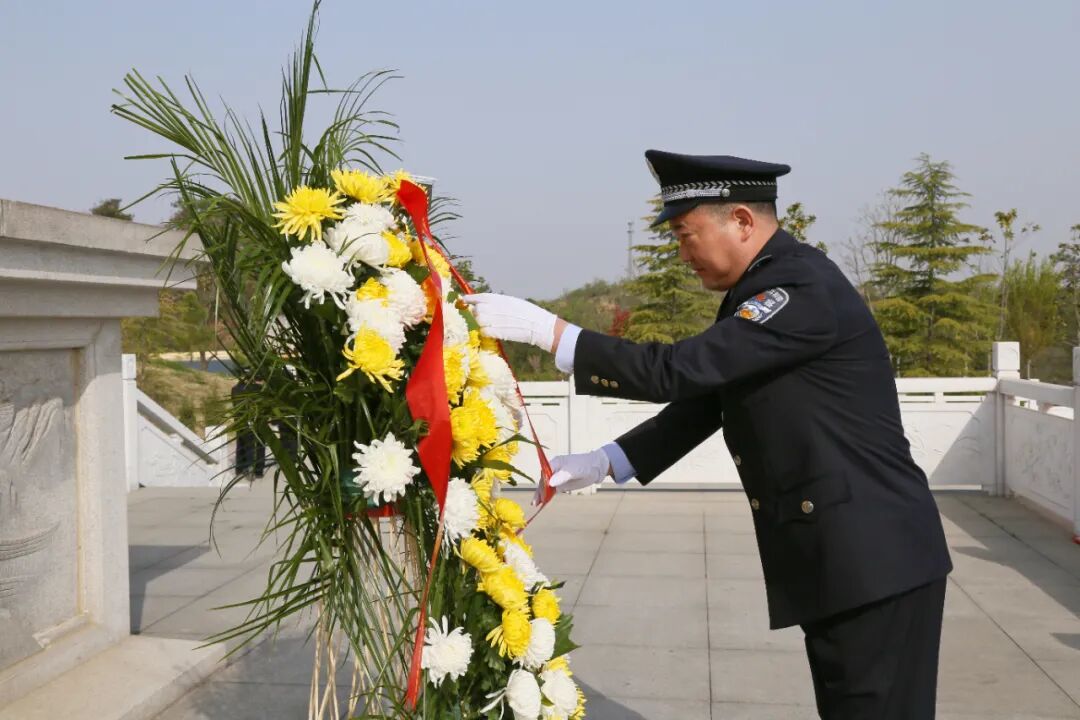 9时许,缅怀活动在雄壮的国歌声中拉开序幕。全体民警整齐列队,面向革命烈士纪念碑高唱中华人民共和国国歌,用雄壮激昂的歌声向曾经的烽火岁月致敬。 “脱帽,默哀!”随着口令落下,全体民警脱帽伫立,陵园陷入寂静。大家警容严整、表情肃穆,向英勇献身的革命英烈和因公殉职的公安民警表达沉痛哀思。